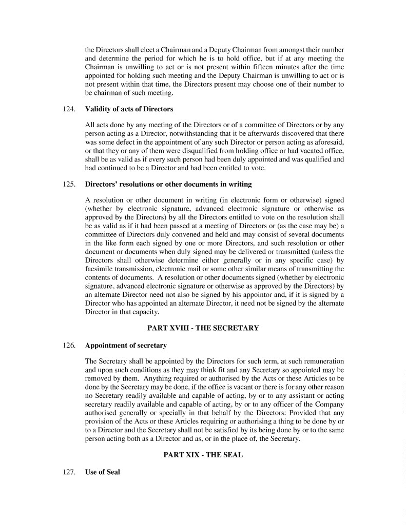 the Directors shall elect a Chairman and a Deputy Chairman from amongst their number and determine the period for which he is to hold office, but if at any meeting the Chairman is unwilling to act or is not present within fifteen minutes after the time appointed for holding such meeting and the Deputy Chairman is unwilling to act or is not present within that time, the Directors present may choose one of their number to be chairman of such meeting. 124. Validity of acts of Directors All acts done by any meeting of the Directors or of a committee of Directors or by any person acting as a Director, notwithstanding that it be afterwards discovered that there was some defect in the appointment of any such Director or person acting as aforesaid, or that they or any of them were disqualified from holding office or had vacated office, shall be as valid as if every such person had been duly appointed and was qualified and had continued to be a Director and had been entitled to vote. 125. Directors’ resolutions or other documents in writing A resolution or other document in writing (in electronic form or otherwise) signed (whether by electronic signature, advanced electronic signature or otherwise as approved by the Directors) by all the Directors entitled to vote on the resolution shall be as valid as if it had been passed at a meeting of Directors or (as the case may be) a committee of Directors duly convened and held and may consist of several documents in the like form each signed by one or more Directors, and such resolution or other document or documents when duly signed may be delivered or transmitted (unless the Directors shall otherwise determine either generally or in any specific case) by facsimile transmission, electronic mail or some other similar means of transmitting the contents of documents. A resolution or other documents signed (whether by electronic signature, advanced electronic signature or otherwise as approved by the Directors) by an alternate Director need not also be signed by his appointor and, if it is signed by a Director who has appointed an alternate Director, it need not be signed by the alternate Director in that capacity. PART XVIII - THE SECRETARY 126. Appointment of secretary The Secretary shall be appointed by the Directors for such term, at such remuneration and upon such conditions as they may think fit and any Secretary so appointed may be removed by them. Anything required or authorised by the Acts or these Articles to be done by the Secretary may be done, if the office is vacant or there is for any other reason no Secretary readily available and capable of acting, by or to any assistant or acting secretary readily available and capable of acting, by or to any officer of the Company authorised generally or specially in that behalf by the Directors: Provided that any provision of the Acts or these Articles requiring or authorising a thing to be done by or to a Director and the Secretary shall not be satisfied by its being done by or to the same person acting both as a Director and as, or in the place of, the Secretary. PART XIX - THE SEAL 127. Use of Seal