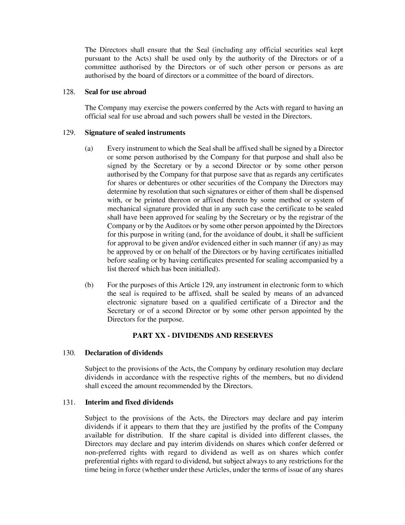 The Directors shall ensure that the Seal (including any official securities seal kept pursuant to the Acts) shall be used only by the authority of the Directors or of a committee authorised by the Directors or of such other person or persons as are authorised by the board of directors or a committee of the board of directors. 128. Seal for use abroad The Company may exercise the powers conferred by the Acts with regard to having an official seal for use abroad and such powers shall be vested in the Directors. 129. Signature of sealed instruments (a) Every instrument to which the Seal shall be affixed shall be signed by a Director or some person authorised by the Company for that purpose and shall also be signed by the Secretary or by a second Director or by some other person authorised by the Company for that purpose save that as regards any certificates for shares or debentures or other securities of the Company the Directors may determine by resolution that such signatures or either of them shall be dispensed with, or be printed thereon or affixed thereto by some method or system of mechanical signature provided that in any such case the certificate to be sealed shall have been approved for sealing by the Secretary or by the registrar of the Company or by the Auditors or by some other person appointed by the Directors for this purpose in writing (and, for the avoidance of doubt, it shall be sufficient for approval to be given and/or evidenced either in such manner (if any) as may be approved by or on behalf of the Directors or by having certificates initialled before sealing or by having certificates presented for sealing accompanied by a list thereof which has been initialled). (b) For the purposes of this Article 129, any instrument in electronic form to which the seal is required to be affixed, shall be sealed by means of an advanced electronic signature based on a qualified certificate of a Director and the Secretary or of a second Director or by some other person appointed by the Directors for the purpose. PART XX - DIVIDENDS AND RESERVES 130. Declaration of dividends Subject to the provisions of the Acts, the Company by ordinary resolution may declare dividends in accordance with the respective rights of the members, but no dividend shall exceed the amount recommended by the Directors. 131. Interim and fixed dividends Subject to the provisions of the Acts, the Directors may declare and pay interim dividends if it appears to them that they are justified by the profits of the Company available for distribution. If the share capital is divided into different classes, the Directors may declare and pay interim dividends on shares which confer deferred or non-preferred rights with regard to dividend as well as on shares which confer preferential rights with regard to dividend, but subject always to any restrictions for the time being in force (whether under these Articles, under the terms of issue of any shares