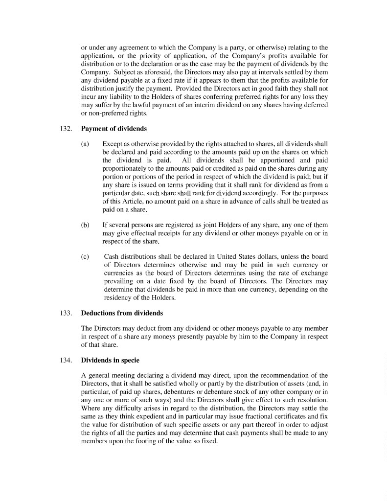 or under any agreement to which the Company is a party, or otherwise) relating to the application, or the priority of application, of the Company’s profits available for distribution or to the declaration or as the case may be the payment of dividends by the Company. Subject as aforesaid, the Directors may also pay at intervals settled by them any dividend payable at a fixed rate if it appears to them that the profits available for distribution justify the payment. Provided the Directors act in good faith they shall not incur any liability to the Holders of shares conferring preferred rights for any loss they may suffer by the lawful payment of an interim dividend on any shares having deferred or non-preferred rights. 132. Payment of dividends (a) Except as otherwise provided by the rights attached to shares, all dividends shall be declared and paid according to the amounts paid up on the shares on which the dividend is paid. All dividends shall be apportioned and paid proportionately to the amounts paid or credited as paid on the shares during any portion or portions of the period in respect of which the dividend is paid; but if any share is issued on terms providing that it shall rank for dividend as from a particular date, such share shall rank for dividend accordingly. For the purposes of this Article, no amount paid on a share in advance of calls shall be treated as paid on a share. (b) If several persons are registered as joint Holders of any share, any one of them may give effectual receipts for any dividend or other moneys payable on or in respect of the share. (c) Cash distributions shall be declared in United States dollars, unless the board of Directors determines otherwise and may be paid in such currency or currencies as the board of Directors determines using the rate of exchange prevailing on a date fixed by the board of Directors. The Directors may determine that dividends be paid in more than one currency, depending on the residency of the Holders. 133. Deductions from dividends The Directors may deduct from any dividend or other moneys payable to any member in respect of a share any moneys presently payable by him to the Company in respect of that share. 134. Dividends in specie A general meeting declaring a dividend may direct, upon the recommendation of the Directors, that it shall be satisfied wholly or partly by the distribution of assets (and, in particular, of paid up shares, debentures or debenture stock of any other company or in any one or more of such ways) and the Directors shall give effect to such resolution. Where any difficulty arises in regard to the distribution, the Directors may settle the same as they think expedient and in particular may issue fractional certificates and fix the value for distribution of such specific assets or any part thereof in order to adjust the rights of all the parties and may determine that cash payments shall be made to any members upon the footing of the value so fixed.