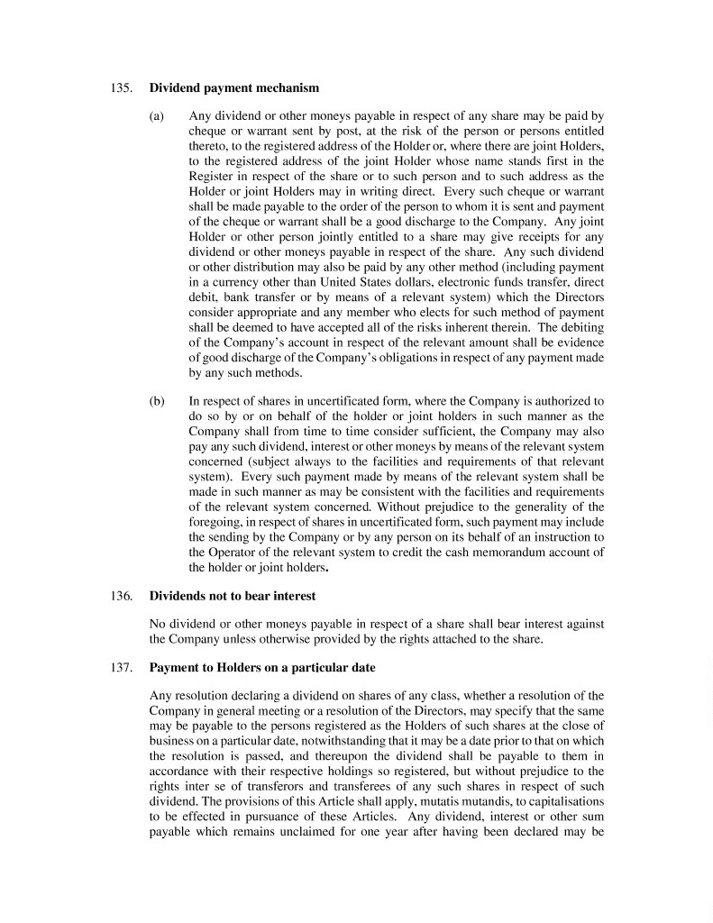 135. Dividend payment mechanism (a) Any dividend or other moneys payable in respect of any share may be paid by cheque or warrant sent by post, at the risk of the person or persons entitled thereto, to the registered address of the Holder or, where there are joint Holders, to the registered address of the joint Holder whose name stands first in the Register in respect of the share or to such person and to such address as the Holder or joint Holders may in writing direct. Every such cheque or warrant shall be made payable to the order of the person to whom it is sent and payment of the cheque or warrant shall be a good discharge to the Company. Any joint Holder or other person jointly entitled to a share may give receipts for any dividend or other moneys payable in respect of the share. Any such dividend or other distribution may also be paid by any other method (including payment in a currency other than United States dollars, electronic funds transfer, direct debit, bank transfer or by means of a relevant system) which the Directors consider appropriate and any member who elects for such method of payment shall be deemed to have accepted all of the risks inherent therein. The debiting of the Company’s account in respect of the relevant amount shall be evidence of good discharge of the Company’s obligations in respect of any payment made by any such methods. (b) In respect of shares in uncertificated form, where the Company is authorized to do so by or on behalf of the holder or joint holders in such manner as the Company shall from time to time consider sufficient, the Company may also pay any such dividend, interest or other moneys by means of the relevant system concerned (subject always to the facilities and requirements of that relevant system). Every such payment made by means of the relevant system shall be made in such manner as may be consistent with the facilities and requirements of the relevant system concerned. Without prejudice to the generality of the foregoing, in respect of shares in uncertificated form, such payment may include the sending by the Company or by any person on its behalf of an instruction to the Operator of the relevant system to credit the cash memorandum account of the holder or joint holders . 136. Dividends not to bear interest No dividend or other moneys payable in respect of a share shall bear interest against the Company unless otherwise provided by the rights attached to the share. 137. Payment to Holders on a particular date Any resolution declaring a dividend on shares of any class, whether a resolution of the Company in general meeting or a resolution of the Directors, may specify that the same may be payable to the persons registered as the Holders of such shares at the close of business on a particular date, notwithstanding that it may be a date prior to that on which the resolution is passed, and thereupon the dividend shall be payable to them in accordance with their respective holdings so registered, but without prejudice to the rights inter se of transferors and transferees of any such shares in respect of such dividend. The provisions of this Article shall apply, mutatis mutandis, to capitalisations to be effected in pursuance of these Articles. Any dividend, interest or other sum payable which remains unclaimed for one year after having been declared may be