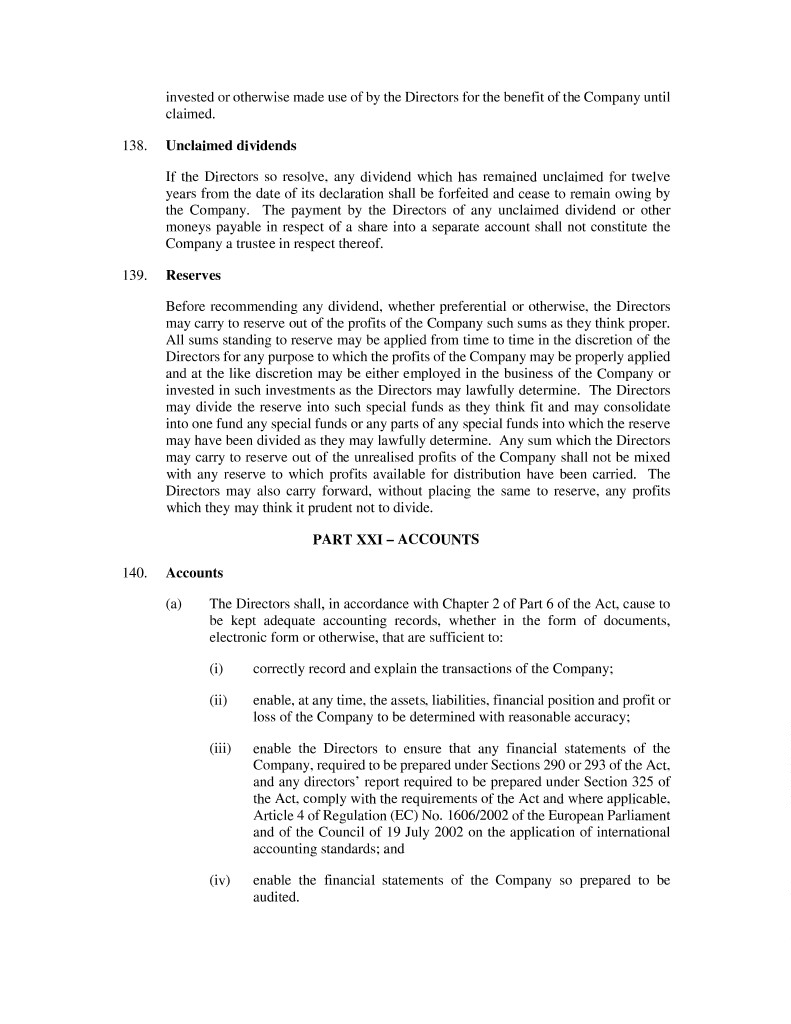 invested or otherwise made use of by the Directors for the benefit of the Company until claimed. 138. Unclaimed dividends If the Directors so resolve, any dividend which has remained unclaimed for twelve years from the date of its declaration shall be forfeited and cease to remain owing by the Company. The payment by the Directors of any unclaimed dividend or other moneys payable in respect of a share into a separate account shall not constitute the Company a trustee in respect thereof. 139. Reserves Before recommending any dividend, whether preferential or otherwise, the Directors may carry to reserve out of the profits of the Company such sums as they think proper. All sums standing to reserve may be applied from time to time in the discretion of the Directors for any purpose to which the profits of the Company may be properly applied and at the like discretion may be either employed in the business of the Company or invested in such investments as the Directors may lawfully determine. The Directors may divide the reserve into such special funds as they think fit and may consolidate into one fund any special funds or any parts of any special funds into which the reserve may have been divided as they may lawfully determine. Any sum which the Directors may carry to reserve out of the unrealised profits of the Company shall not be mixed with any reserve to which profits available for distribution have been carried. The Directors may also carry forward, without placing the same to reserve, any profits which they may think it prudent not to divide. PART XXI – ACCOUNTS 140. Accounts (a) The Directors shall, in accordance with Chapter 2 of Part 6 of the Act, cause to be kept adequate accounting records, whether in the form of documents, electronic form or otherwise, that are sufficient to: (i) correctly record and explain the transactions of the Company; (ii) enable, at any time, the assets, liabilities, financial position and profit or loss of the Company to be determined with reasonable accuracy; (iii) enable the Directors to ensure that any financial statements of the Company, required to be prepared under Sections 290 or 293 of the Act, and any directors’ report required to be prepared under Section 325 of the Act, comply with the requirements of the Act and where applicable, Article 4 of Regulation (EC) No. 1606/2002 of the European Parliament and of the Council of 19 July 2002 on the application of international accounting standards; and (iv) enable the financial statements of the Company so prepared to be audited.