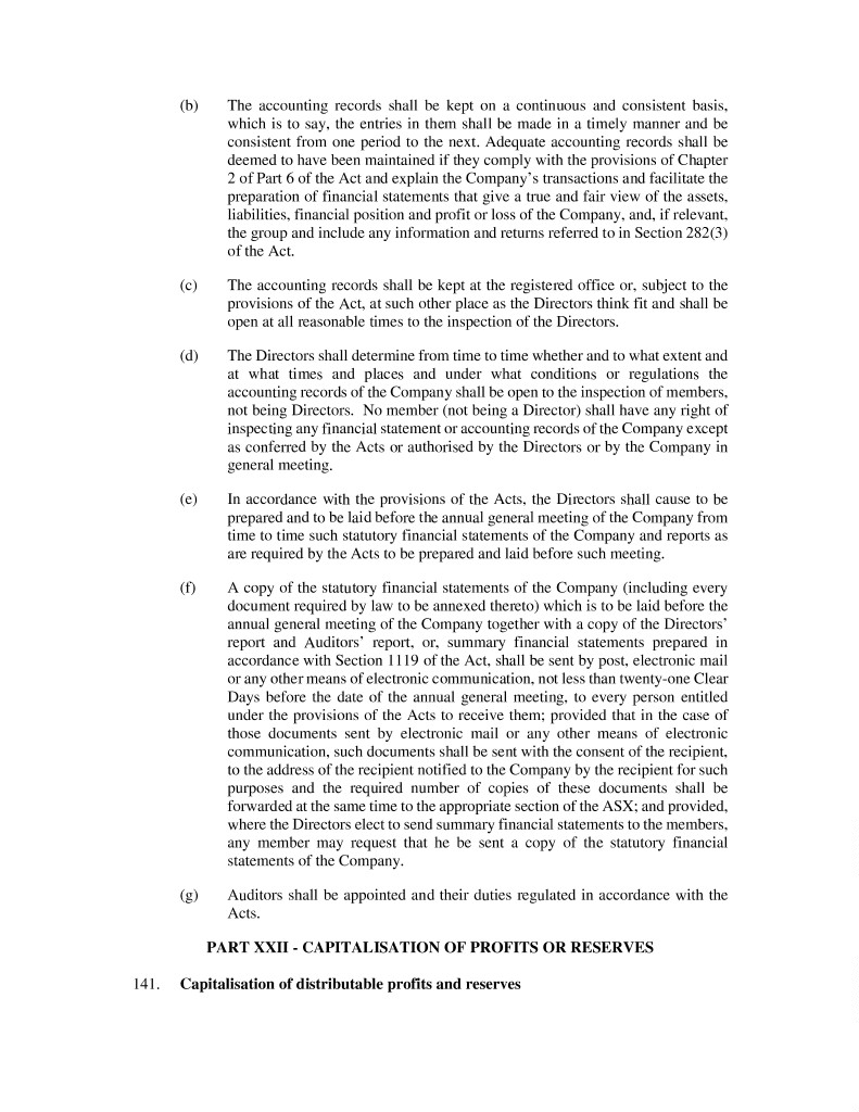 (b) The accounting records shall be kept on a continuous and consistent basis, which is to say, the entries in them shall be made in a timely manner and be consistent from one period to the next. Adequate accounting records shall be deemed to have been maintained if they comply with the provisions of Chapter 2 of Part 6 of the Act and explain the Company’s transactions and facilitate the preparation of financial statements that give a true and fair view of the assets, liabilities, financial position and profit or loss of the Company, and, if relevant, the group and include any information and returns referred to in Section 282(3) of the Act. (c) The accounting records shall be kept at the registered office or, subject to the provisions of the Act, at such other place as the Directors think fit and shall be open at all reasonable times to the inspection of the Directors. (d) The Directors shall determine from time to time whether and to what extent and at what times and places and under what conditions or regulations the accounting records of the Company shall be open to the inspection of members, not being Directors. No member (not being a Director) shall have any right of inspecting any financial statement or accounting records of the Company except as conferred by the Acts or authorised by the Directors or by the Company in general meeting. (e) In accordance with the provisions of the Acts, the Directors shall cause to be prepared and to be laid before the annual general meeting of the Company from time to time such statutory financial statements of the Company and reports as are required by the Acts to be prepared and laid before such meeting. (f) A copy of the statutory financial statements of the Company (including every document required by law to be annexed thereto) which is to be laid before the annual general meeting of the Company together with a copy of the Directors’ report and Auditors’ report, or, summary financial statements prepared in accordance with Section 1119 of the Act, shall be sent by post, electronic mail or any other means of electronic communication, not less than twenty-one Clear Days before the date of the annual general meeting, to every person entitled under the provisions of the Acts to receive them; provided that in the case of those documents sent by electronic mail or any other means of electronic communication, such documents shall be sent with the consent of the recipient, to the address of the recipient notified to the Company by the recipient for such purposes and the required number of copies of these documents shall be forwarded at the same time to the appropriate section of the ASX; and provided, where the Directors elect to send summary financial statements to the members, any member may request that he be sent a copy of the statutory financial statements of the Company. (g) Auditors shall be appointed and their duties regulated in accordance with the Acts. PART XXII - CAPITALISATION OF PROFITS OR RESERVES 141. Capitalisation of distributable profits and reserves