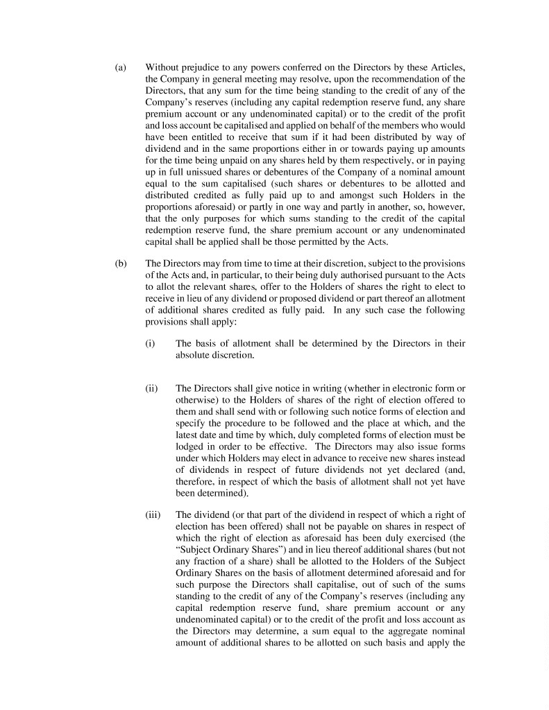 (a) Without prejudice to any powers conferred on the Directors by these Articles, the Company in general meeting may resolve, upon the recommendation of the Directors, that any sum for the time being standing to the credit of any of the Company’s reserves (including any capital redemption reserve fund, any share premium account or any undenominated capital) or to the credit of the profit and loss account be capitalised and applied on behalf of the members who would have been entitled to receive that sum if it had been distributed by way of dividend and in the same proportions either in or towards paying up amounts for the time being unpaid on any shares held by them respectively, or in paying up in full unissued shares or debentures of the Company of a nominal amount equal to the sum capitalised (such shares or debentures to be allotted and distributed credited as fully paid up to and amongst such Holders in the proportions aforesaid) or partly in one way and partly in another, so, however, that the only purposes for which sums standing to the credit of the capital redemption reserve fund, the share premium account or any undenominated capital shall be applied shall be those permitted by the Acts. (b) The Directors may from time to time at their discretion, subject to the provisions of the Acts and, in particular, to their being duly authorised pursuant to the Acts to allot the relevant shares, offer to the Holders of shares the right to elect to receive in lieu of any dividend or proposed dividend or part thereof an allotment of additional shares credited as fully paid. In any such case the following provisions shall apply: (i) The basis of allotment shall be determined by the Directors in their absolute discretion. (ii) The Directors shall give notice in writing (whether in electronic form or otherwise) to the Holders of shares of the right of election offered to them and shall send with or following such notice forms of election and specify the procedure to be followed and the place at which, and the latest date and time by which, duly completed forms of election must be lodged in order to be effective. The Directors may also issue forms under which Holders may elect in advance to receive new shares instead of dividends in respect of future dividends not yet declared (and, therefore, in respect of which the basis of allotment shall not yet have been determined). (iii) The dividend (or that part of the dividend in respect of which a right of election has been offered) shall not be payable on shares in respect of which the right of election as aforesaid has been duly exercised (the “Subject Ordinary Shares”) and in lieu thereof additional shares (but not any fraction of a share) shall be allotted to the Holders of the Subject Ordinary Shares on the basis of allotment determined aforesaid and for such purpose the Directors shall capitalise, out of such of the sums standing to the credit of any of the Company’s reserves (including any capital redemption reserve fund, share premium account or any undenominated capital) or to the credit of the profit and loss account as the Directors may determine, a sum equal to the aggregate nominal amount of additional shares to be allotted on such basis and apply the