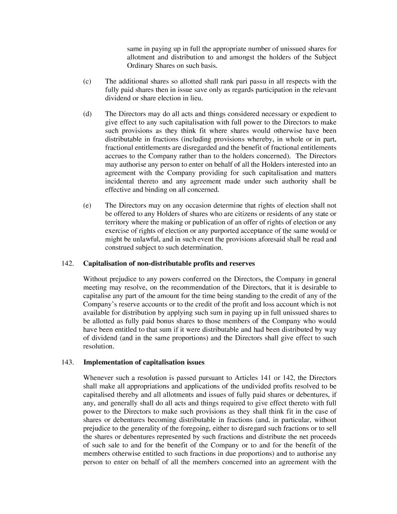 same in paying up in full the appropriate number of unissued shares for allotment and distribution to and amongst the holders of the Subject Ordinary Shares on such basis. (c) The additional shares so allotted shall rank pari passu in all respects with the fully paid shares then in issue save only as regards participation in the relevant dividend or share election in lieu. (d) The Directors may do all acts and things considered necessary or expedient to give effect to any such capitalisation with full power to the Directors to make such provisions as they think fit where shares would otherwise have been distributable in fractions (including provisions whereby, in whole or in part, fractional entitlements are disregarded and the benefit of fractional entitlements accrues to the Company rather than to the holders concerned). The Directors may authorise any person to enter on behalf of all the Holders interested into an agreement with the Company providing for such capitalisation and matters incidental thereto and any agreement made under such authority shall be effective and binding on all concerned. (e) The Directors may on any occasion determine that rights of election shall not be offered to any Holders of shares who are citizens or residents of any state or territory where the making or publication of an offer of rights of election or any exercise of rights of election or any purported acceptance of the same would or might be unlawful, and in such event the provisions aforesaid shall be read and construed subject to such determination. 142. Capitalisation of non-distributable profits and reserves Without prejudice to any powers conferred on the Directors, the Company in general meeting may resolve, on the recommendation of the Directors, that it is desirable to capitalise any part of the amount for the time being standing to the credit of any of the Company’s reserve accounts or to the credit of the profit and loss account which is not available for distribution by applying such sum in paying up in full unissued shares to be allotted as fully paid bonus shares to those members of the Company who would have been entitled to that sum if it were distributable and had been distributed by way of dividend (and in the same proportions) and the Directors shall give effect to such resolution. 143. Implementation of capitalisation issues Whenever such a resolution is passed pursuant to Articles 141 or 142, the Directors shall make all appropriations and applications of the undivided profits resolved to be capitalised thereby and all allotments and issues of fully paid shares or debentures, if any, and generally shall do all acts and things required to give effect thereto with full power to the Directors to make such provisions as they shall think fit in the case of shares or debentures becoming distributable in fractions (and, in particular, without prejudice to the generality of the foregoing, either to disregard such fractions or to sell the shares or debentures represented by such fractions and distribute the net proceeds of such sale to and for the benefit of the Company or to and for the benefit of the members otherwise entitled to such fractions in due proportions) and to authorise any person to enter on behalf of all the members concerned into an agreement with the
