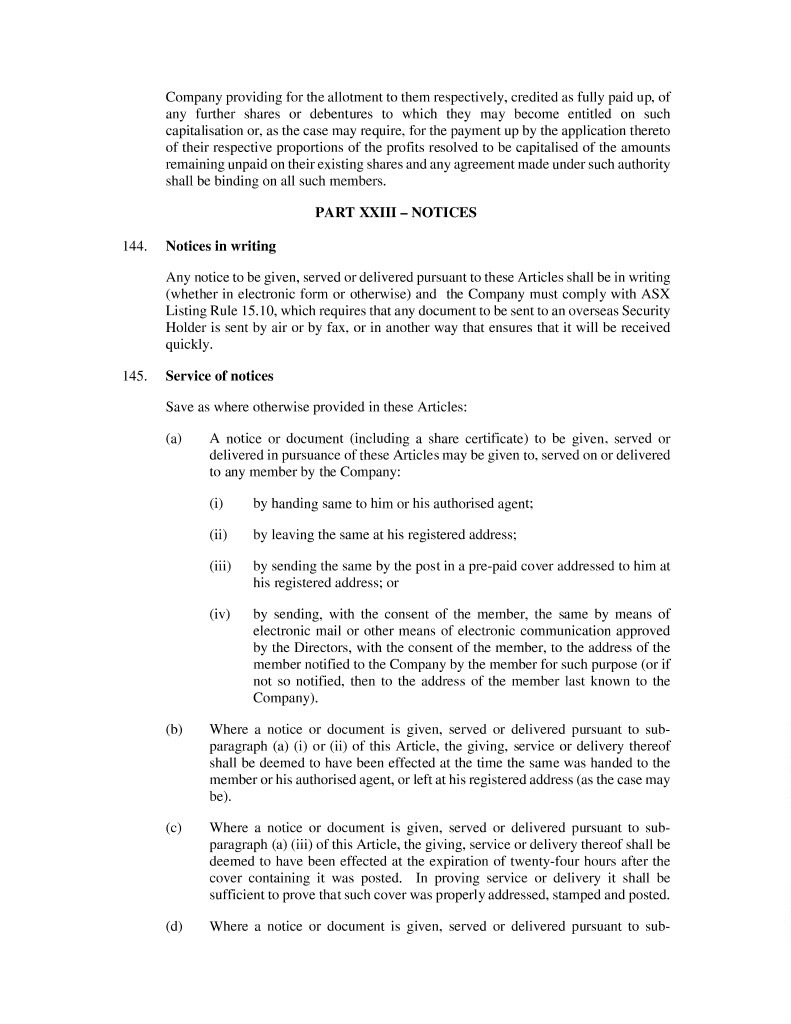 Company providing for the allotment to them respectively, credited as fully paid up, of any further shares or debentures to which they may become entitled on such capitalisation or, as the case may require, for the payment up by the application thereto of their respective proportions of the profits resolved to be capitalised of the amounts remaining unpaid on their existing shares and any agreement made under such authority shall be binding on all such members. PART XXIII – NOTICES 144. Notices in writing Any notice to be given, served or delivered pursuant to these Articles shall be in writing (whether in electronic form or otherwise) and the Company must comply with ASX Listing Rule 15.10, which requires that any document to be sent to an overseas Security Holder is sent by air or by fax, or in another way that ensures that it will be received quickly. 145. Service of notices Save as where otherwise provided in these Articles: (a) A notice or document (including a share certificate) to be given, served or delivered in pursuance of these Articles may be given to, served on or delivered to any member by the Company: (i) by handing same to him or his authorised agent; (ii) by leaving the same at his registered address; (iii) by sending the same by the post in a pre-paid cover addressed to him at his registered address; or (iv) by sending, with the consent of the member, the same by means of electronic mail or other means of electronic communication approved by the Directors, with the consent of the member, to the address of the member notified to the Company by the member for such purpose (or if not so notified, then to the address of the member last known to the Company). (b) Where a notice or document is given, served or delivered pursuant to sub- paragraph (a) (i) or (ii) of this Article, the giving, service or delivery thereof shall be deemed to have been effected at the time the same was handed to the member or his authorised agent, or left at his registered address (as the case may be). (c) Where a notice or document is given, served or delivered pursuant to sub- paragraph (a) (iii) of this Article, the giving, service or delivery thereof shall be deemed to have been effected at the expiration of twenty-four hours after the cover containing it was posted. In proving service or delivery it shall be sufficient to prove that such cover was properly addressed, stamped and posted. (d) Where a notice or document is given, served or delivered pursuant to sub-