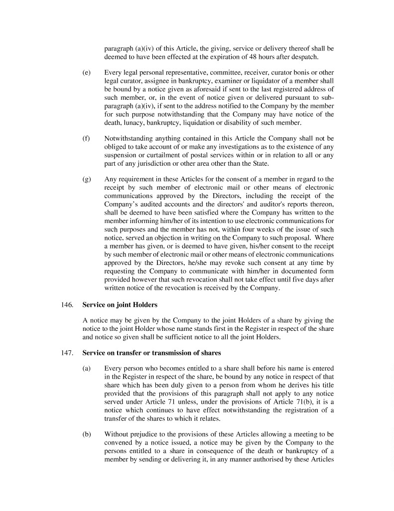 paragraph (a)(iv) of this Article, the giving, service or delivery thereof shall be deemed to have been effected at the expiration of 48 hours after despatch. (e) Every legal personal representative, committee, receiver, curator bonis or other legal curator, assignee in bankruptcy, examiner or liquidator of a member shall be bound by a notice given as aforesaid if sent to the last registered address of such member, or, in the event of notice given or delivered pursuant to sub- paragraph (a)(iv), if sent to the address notified to the Company by the member for such purpose notwithstanding that the Company may have notice of the death, lunacy, bankruptcy, liquidation or disability of such member. (f) Notwithstanding anything contained in this Article the Company shall not be obliged to take account of or make any investigations as to the existence of any suspension or curtailment of postal services within or in relation to all or any part of any jurisdiction or other area other than the State. (g) Any requirement in these Articles for the consent of a member in regard to the receipt by such member of electronic mail or other means of electronic communications approved by the Directors, including the receipt of the Company’s audited accounts and the directors' and auditor's reports thereon, shall be deemed to have been satisfied where the Company has written to the member informing him/her of its intention to use electronic communications for such purposes and the member has not, within four weeks of the issue of such notice, served an objection in writing on the Company to such proposal. Where a member has given, or is deemed to have given, his/her consent to the receipt by such member of electronic mail or other means of electronic communications approved by the Directors, he/she may revoke such consent at any time by requesting the Company to communicate with him/her in documented form provided however that such revocation shall not take effect until five days after written notice of the revocation is received by the Company. 146. Service on joint Holders A notice may be given by the Company to the joint Holders of a share by giving the notice to the joint Holder whose name stands first in the Register in respect of the share and notice so given shall be sufficient notice to all the joint Holders. 147. Service on transfer or transmission of shares (a) Every person who becomes entitled to a share shall before his name is entered in the Register in respect of the share, be bound by any notice in respect of that share which has been duly given to a person from whom he derives his title provided that the provisions of this paragraph shall not apply to any notice served under Article 71 unless, under the provisions of Article 71(b), it is a notice which continues to have effect notwithstanding the registration of a transfer of the shares to which it relates. (b) Without prejudice to the provisions of these Articles allowing a meeting to be convened by a notice issued, a notice may be given by the Company to the persons entitled to a share in consequence of the death or bankruptcy of a member by sending or delivering it, in any manner authorised by these Articles