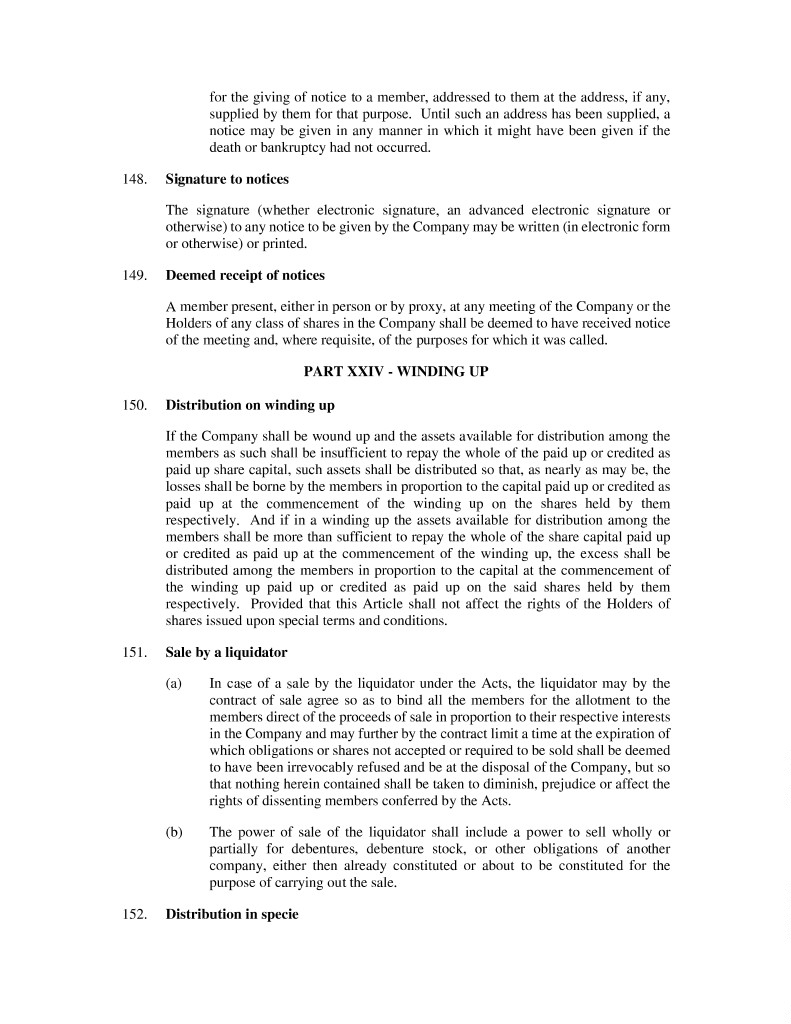 for the giving of notice to a member, addressed to them at the address, if any, supplied by them for that purpose. Until such an address has been supplied, a notice may be given in any manner in which it might have been given if the death or bankruptcy had not occurred. 148. Signature to notices The signature (whether electronic signature, an advanced electronic signature or otherwise) to any notice to be given by the Company may be written (in electronic form or otherwise) or printed. 149. Deemed receipt of notices A member present, either in person or by proxy, at any meeting of the Company or the Holders of any class of shares in the Company shall be deemed to have received notice of the meeting and, where requisite, of the purposes for which it was called. PART XXIV - WINDING UP 150. Distribution on winding up If the Company shall be wound up and the assets available for distribution among the members as such shall be insufficient to repay the whole of the paid up or credited as paid up share capital, such assets shall be distributed so that, as nearly as may be, the losses shall be borne by the members in proportion to the capital paid up or credited as paid up at the commencement of the winding up on the shares held by them respectively. And if in a winding up the assets available for distribution among the members shall be more than sufficient to repay the whole of the share capital paid up or credited as paid up at the commencement of the winding up, the excess shall be distributed among the members in proportion to the capital at the commencement of the winding up paid up or credited as paid up on the said shares held by them respectively. Provided that this Article shall not affect the rights of the Holders of shares issued upon special terms and conditions. 151. Sale by a liquidator (a) In case of a sale by the liquidator under the Acts, the liquidator may by the contract of sale agree so as to bind all the members for the allotment to the members direct of the proceeds of sale in proportion to their respective interests in the Company and may further by the contract limit a time at the expiration of which obligations or shares not accepted or required to be sold shall be deemed to have been irrevocably refused and be at the disposal of the Company, but so that nothing herein contained shall be taken to diminish, prejudice or affect the rights of dissenting members conferred by the Acts. (b) The power of sale of the liquidator shall include a power to sell wholly or partially for debentures, debenture stock, or other obligations of another company, either then already constituted or about to be constituted for the purpose of carrying out the sale. 152. Distribution in specie