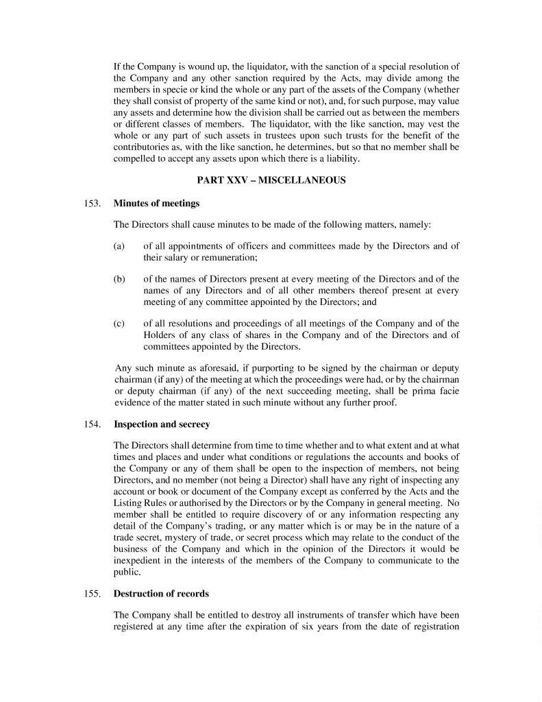 If the Company is wound up, the liquidator, with the sanction of a special resolution of the Company and any other sanction required by the Acts, may divide among the members in specie or kind the whole or any part of the assets of the Company (whether they shall consist of property of the same kind or not), and, for such purpose, may value any assets and determine how the division shall be carried out as between the members or different classes of members. The liquidator, with the like sanction, may vest the whole or any part of such assets in trustees upon such trusts for the benefit of the contributories as, with the like sanction, he determines, but so that no member shall be compelled to accept any assets upon which there is a liability. PART XXV – MISCELLANEOUS 153. Minutes of meetings The Directors shall cause minutes to be made of the following matters, namely: (a) of all appointments of officers and committees made by the Directors and of their salary or remuneration; (b) of the names of Directors present at every meeting of the Directors and of the names of any Directors and of all other members thereof present at every meeting of any committee appointed by the Directors; and (c) of all resolutions and proceedings of all meetings of the Company and of the Holders of any class of shares in the Company and of the Directors and of committees appointed by the Directors. Any such minute as aforesaid, if purporting to be signed by the chairman or deputy chairman (if any) of the meeting at which the proceedings were had, or by the chairman or deputy chairman (if any) of the next succeeding meeting, shall be prima facie evidence of the matter stated in such minute without any further proof. 154. Inspection and secrecy The Directors shall determine from time to time whether and to what extent and at what times and places and under what conditions or regulations the accounts and books of the Company or any of them shall be open to the inspection of members, not being Directors, and no member (not being a Director) shall have any right of inspecting any account or book or document of the Company except as conferred by the Acts and the Listing Rules or authorised by the Directors or by the Company in general meeting. No member shall be entitled to require discovery of or any information respecting any detail of the Company’s trading, or any matter which is or may be in the nature of a trade secret, mystery of trade, or secret process which may relate to the conduct of the business of the Company and which in the opinion of the Directors it would be inexpedient in the interests of the members of the Company to communicate to the public. 155. Destruction of records The Company shall be entitled to destroy all instruments of transfer which have been registered at any time after the expiration of six years from the date of registration