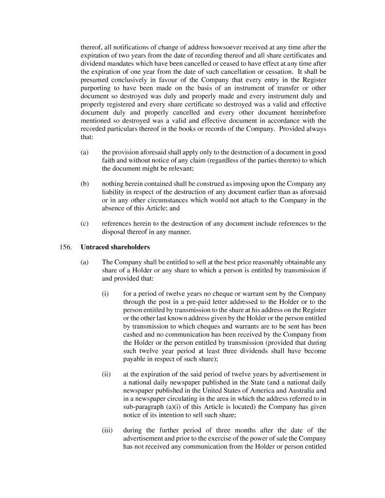 thereof, all notifications of change of address howsoever received at any time after the expiration of two years from the date of recording thereof and all share certificates and dividend mandates which have been cancelled or ceased to have effect at any time after the expiration of one year from the date of such cancellation or cessation. It shall be presumed conclusively in favour of the Company that every entry in the Register purporting to have been made on the basis of an instrument of transfer or other document so destroyed was duly and properly made and every instrument duly and properly registered and every share certificate so destroyed was a valid and effective document duly and properly cancelled and every other document hereinbefore mentioned so destroyed was a valid and effective document in accordance with the recorded particulars thereof in the books or records of the Company. Provided always that: (a) the provision aforesaid shall apply only to the destruction of a document in good faith and without notice of any claim (regardless of the parties thereto) to which the document might be relevant; (b) nothing herein contained shall be construed as imposing upon the Company any liability in respect of the destruction of any document earlier than as aforesaid or in any other circumstances which would not attach to the Company in the absence of this Article; and (c) references herein to the destruction of any document include references to the disposal thereof in any manner. 156. Untraced shareholders (a) The Company shall be entitled to sell at the best price reasonably obtainable any share of a Holder or any share to which a person is entitled by transmission if and provided that: (i) for a period of twelve years no cheque or warrant sent by the Company through the post in a pre-paid letter addressed to the Holder or to the person entitled by transmission to the share at his address on the Register or the other last known address given by the Holder or the person entitled by transmission to which cheques and warrants are to be sent has been cashed and no communication has been received by the Company from the Holder or the person entitled by transmission (provided that during such twelve year period at least three dividends shall have become payable in respect of such share); (ii) at the expiration of the said period of twelve years by advertisement in a national daily newspaper published in the State (and a national daily newspaper published in the United States of America and Australia and in a newspaper circulating in the area in which the address referred to in sub-paragraph (a)(i) of this Article is located) the Company has given notice of its intention to sell such share; (iii) during the further period of three months after the date of the advertisement and prior to the exercise of the power of sale the Company has not received any communication from the Holder or person entitled