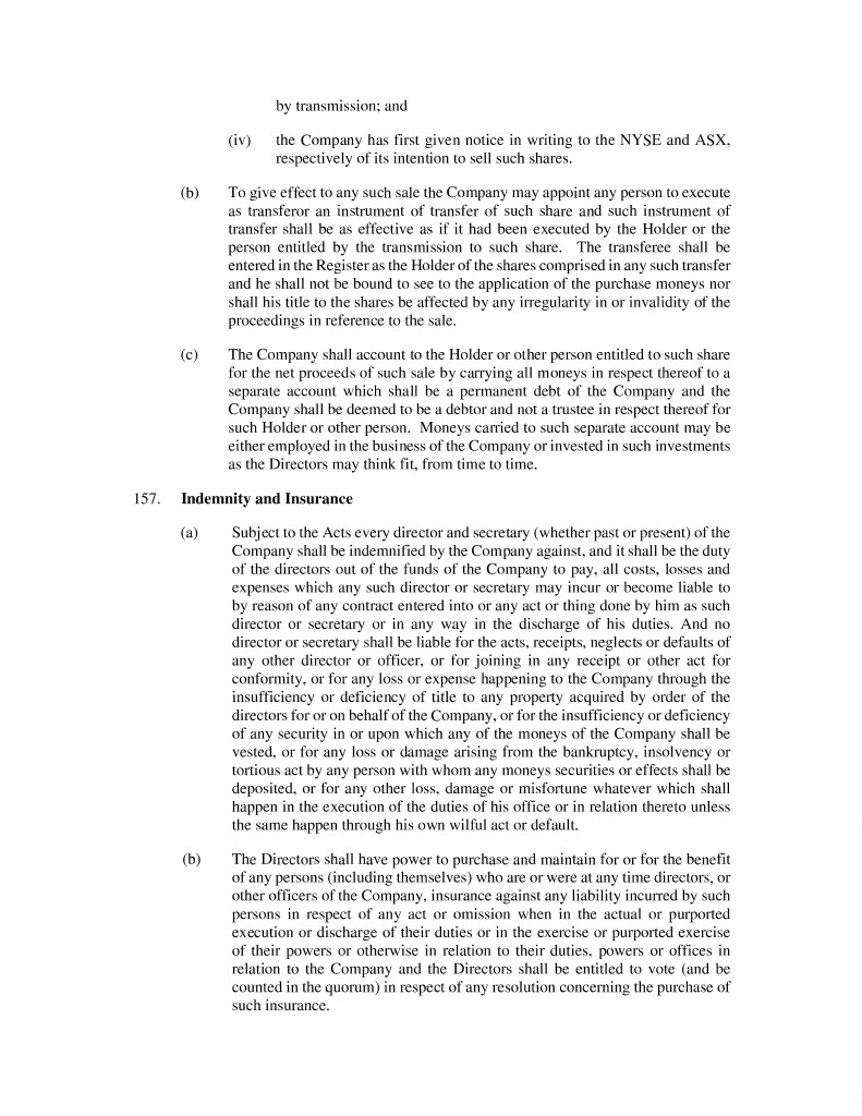 by transmission; and (iv) the Company has first given notice in writing to the NYSE and ASX, respectively of its intention to sell such shares. (b) To give effect to any such sale the Company may appoint any person to execute as transferor an instrument of transfer of such share and such instrument of transfer shall be as effective as if it had been executed by the Holder or the person entitled by the transmission to such share. The transferee shall be entered in the Register as the Holder of the shares comprised in any such transfer and he shall not be bound to see to the application of the purchase moneys nor shall his title to the shares be affected by any irregularity in or invalidity of the proceedings in reference to the sale. (c) The Company shall account to the Holder or other person entitled to such share for the net proceeds of such sale by carrying all moneys in respect thereof to a separate account which shall be a permanent debt of the Company and the Company shall be deemed to be a debtor and not a trustee in respect thereof for such Holder or other person. Moneys carried to such separate account may be either employed in the business of the Company or invested in such investments as the Directors may think fit, from time to time. 157. Indemnity and Insurance (a) Subject to the Acts every director and secretary (whether past or present) of the Company shall be indemnified by the Company against, and it shall be the duty of the directors out of the funds of the Company to pay, all costs, losses and expenses which any such director or secretary may incur or become liable to by reason of any contract entered into or any act or thing done by him as such director or secretary or in any way in the discharge of his duties. And no director or secretary shall be liable for the acts, receipts, neglects or defaults of any other director or officer, or for joining in any receipt or other act for conformity, or for any loss or expense happening to the Company through the insufficiency or deficiency of title to any property acquired by order of the directors for or on behalf of the Company, or for the insufficiency or deficiency of any security in or upon which any of the moneys of the Company shall be vested, or for any loss or damage arising from the bankruptcy, insolvency or tortious act by any person with whom any moneys securities or effects shall be deposited, or for any other loss, damage or misfortune whatever which shall happen in the execution of the duties of his office or in relation thereto unless the same happen through his own wilful act or default. (b) The Directors shall have power to purchase and maintain for or for the benefit of any persons (including themselves) who are or were at any time directors, or other officers of the Company, insurance against any liability incurred by such persons in respect of any act or omission when in the actual or purported execution or discharge of their duties or in the exercise or purported exercise of their powers or otherwise in relation to their duties, powers or offices in relation to the Company and the Directors shall be entitled to vote (and be counted in the quorum) in respect of any resolution concerning the purchase of such insurance.