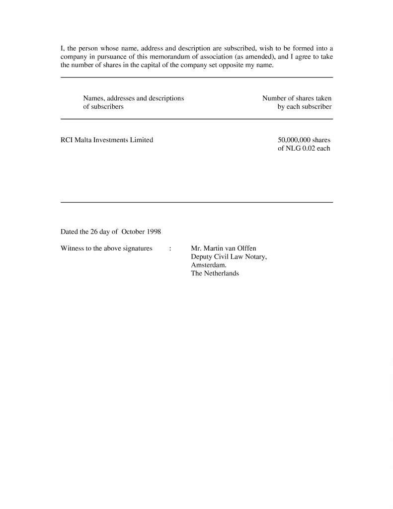 I, the person whose name, address and description are subscribed, wish to be formed into a company in pursuance of this memorandum of association (as amended), and I agree to take the number of shares in the capital of the company set opposite my name. Names, addresses and descriptions Number of shares taken of subscribers by each subscriber RCI Malta Investments Limited 50,000,000 shares of NLG 0.02 each Dated the 26 day of October 1998 Witness to the above signatures : Mr. Martin van Olffen Deputy Civil Law Notary, Amsterdam. The Netherlands