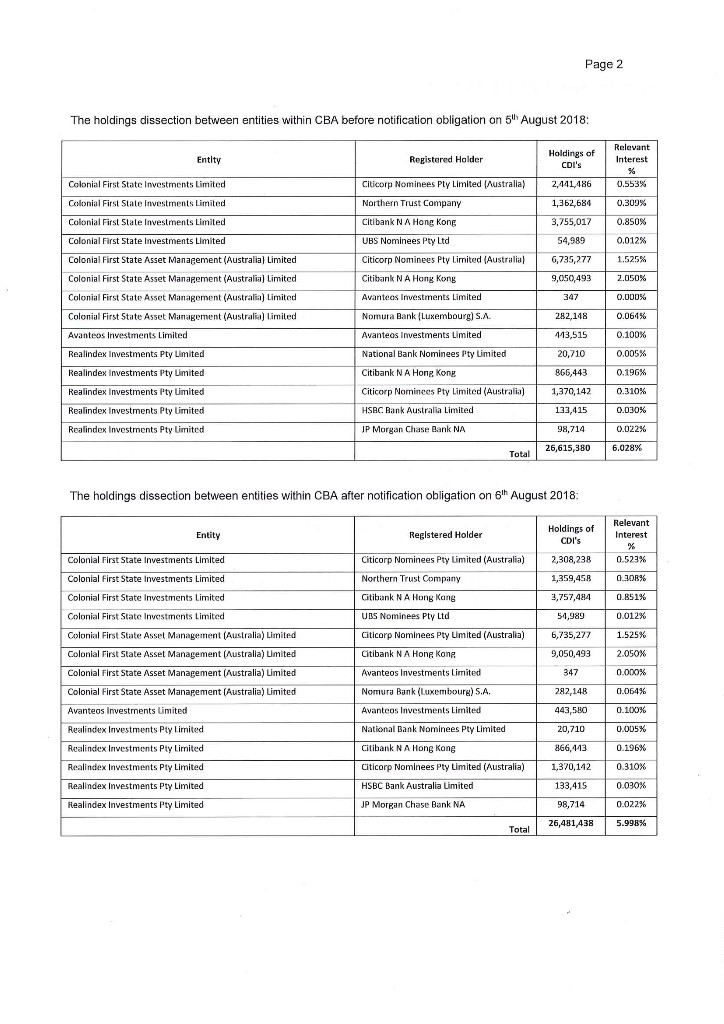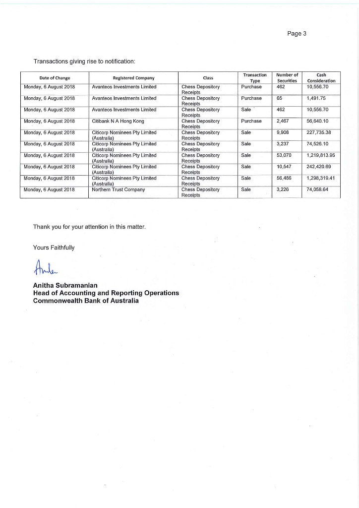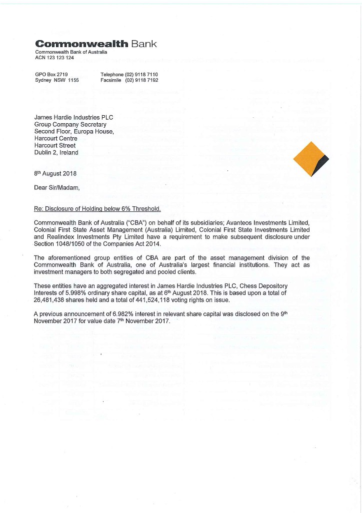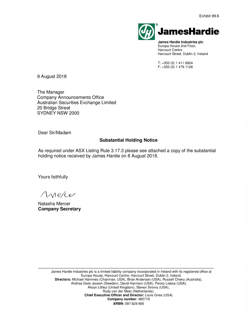 Exhibit 99.6 James Hardie Industries plc Europa House 2nd Floor, Harcourt Centre Harcourt Street, Dublin 2, Ireland T: +353 (0) 1 411 6924 F: +353 (0) 1 479 1128 9 August 2018 The Manager Company Announcements Office Australian Securities Exchange Limited 20 Bridge Street SYDNEY NSW 2000 Dear Sir/Madam Substantial Holding Notice As required under ASX Listing Rule 3.17.3 please see attached a copy of the substantial holding notice received by James Hardie on 8 August 2018. Yours faithfully Natasha Mercer Company Secretary James Hardie Industries plc is a limited liability company incorporated in Ireland with its registered office at Europa House, Harcourt Centre, Harcourt Street, Dublin 2, Ireland. Directors: Michael Hammes (Chairman, USA), Brian Anderson (USA), Russell Chenu (Australia), Andrea Gisle Joosen (Sweden), David Harrison (USA), Persio Lisboa (USA), Alison Littley (United Kingdom), Steven Simms (USA), Rudy van der Meer (Netherlands). Chief Executive Officer and Director: Louis Gries (USA) Company number : 485719 ARBN: 097 829 895