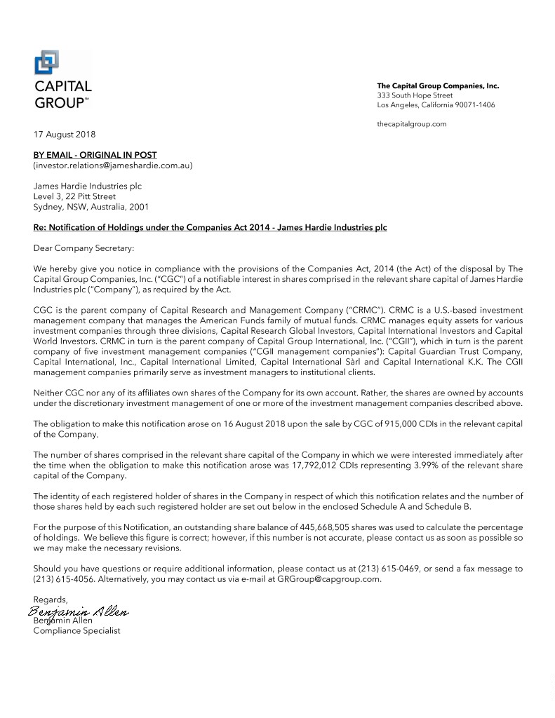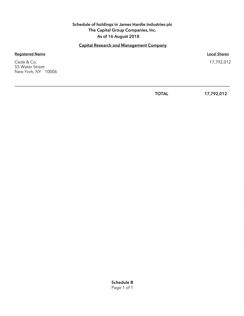 Schedule of holdings in James Hardie Industries plc The Capital Group Companies, Inc. As of 16 August 2018 Capital Research and Management Company Registered Name Local Shares Cede & Co. 17,792,012 55 Water Street New York, NY 10006 TOTAL 17,792,012 Schedule B Page 1 of 1