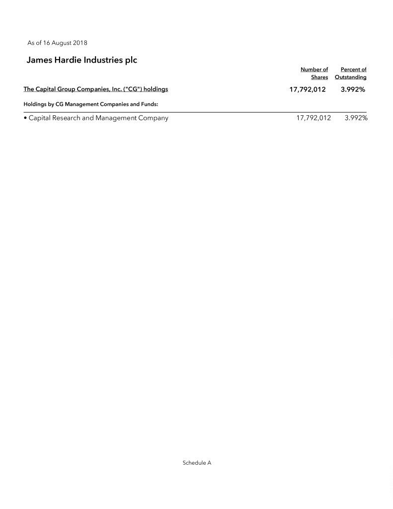 As of 16 August 2018 James Hardie Industries plc Number of Percent of Shares Outstanding The Capital Group Companies, Inc. ("CG") holdings 17,792,012 3.992% Holdings by CG Management Companies and Funds: • Capital Research and Management Company 17,792,012 3.992% Schedule A