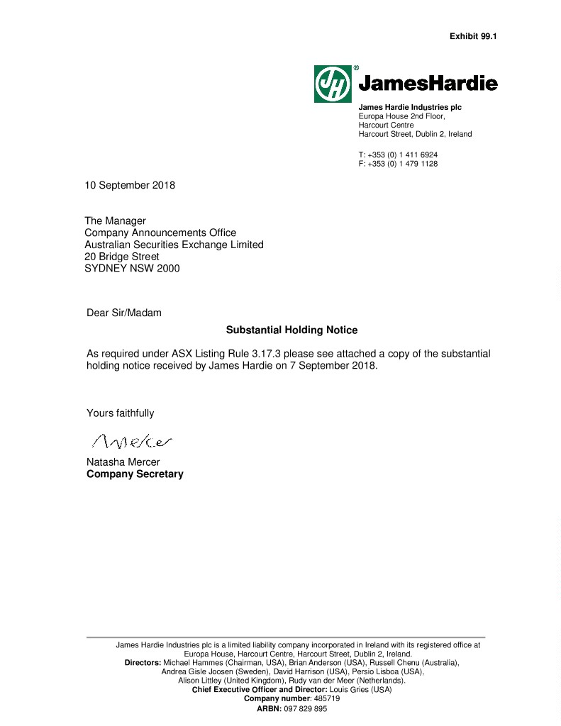Exhibit 99.1 James Hardie Industries plc Europa House 2nd Floor, Harcourt Centre Harcourt Street, Dublin 2, Ireland T: +353 (0) 1 411 6924 F: +353 (0) 1 479 1128 10 September 2018 The Manager Company Announcements Office Australian Securities Exchange Limited 20 Bridge Street SYDNEY NSW 2000 Dear Sir/Madam Substantial Holding Notice As required under ASX Listing Rule 3.17.3 please see attached a copy of the substantial holding notice received by James Hardie on 7 September 2018. Yours faithfully Natasha Mercer Company Secretary James Hardie Industries plc is a limited liability company incorporated in Ireland with its registered office at Europa House, Harcourt Centre, Harcourt Street, Dublin 2, Ireland. Directors: Michael Hammes (Chairman, USA), Brian Anderson (USA), Russell Chenu (Australia), Andrea Gisle Joosen (Sweden), David Harrison (USA), Persio Lisboa (USA), Alison Littley (United Kingdom), Rudy van der Meer (Netherlands). Chief Executive Officer and Director: Louis Gries (USA) Company number: 485719 ARBN: 097 829 895