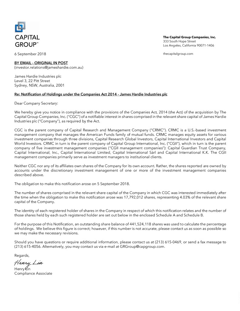 The Capital Group Companies, Inc. 333 South Hope Street Los Angeles, California 90071-1406 6 September 2018 thecapitalgroup.com BY EMAIL - ORIGINAL IN POST ([email protected]) James Hardie Industries plc Level 3, 22 Pitt Street Sydney, NSW, Australia, 2001 Re: Notification of Holdings under the Companies Act 2014 - James Hardie Industries plc Dear Company Secretary: We hereby give you notice in compliance with the provisions of the Companies Act, 2014 (the Act) of the acquisition by The Capital Group Companies, Inc. (“CGC”) of a notifiable interest in shares comprised in the relevant share capital of James Hardie Industries plc (“Company”), as required by the Act. CGC is the parent company of Capital Research and Management Company (“CRMC”). CRMC is a U.S.-based investment management company that manages the American Funds family of mutual funds. CRMC manages equity assets for various investment companies through three divisions, Capital Research Global Investors, Capital International Investors and Capital World Investors. CRMC in turn is the parent company of Capital Group International, Inc. (“CGII”), which in turn is the parent company of five investment management companies (“CGII management companies”): Capital Guardian Trust Company, Capital International, Inc., Capital International Limited, Capital International Sàrl and Capital International K.K. The CGII management companies primarily serve as investment managers to institutional clients. Neither CGC nor any of its affiliates own shares of the Company for its own account. Rather, the shares reported are owned by accounts under the discretionary investment management of one or more of the investment management companies described above. The obligation to make this notification arose on 5 September 2018. The number of shares comprised in the relevant share capital of the Company in which CGC was interested immediately after the time when the obligation to make this notification arose was 17,792,012 shares, representing 4.03% of the relevant share capital of the Company. The identity of each registered holder of shares in the Company in respect of which this notification relates and the number of those shares held by each such registered holder are set out below in the enclosed Schedule A and Schedule B. For the purpose of this Notification, an outstanding share balance of 441,524,118 shares was used to calculate the percentage of holdings. We believe this figure is correct; however, if this number is not accurate, please contact us as soon as possible so we may make the necessary revisions. Should you have questions or require additional information, please contact us at (213) 615-0469, or send a fax message to (213) 615-4056. Alternatively, you may contact us via e-mail at [email protected]. Regards, Henry Lin Compliance Associate