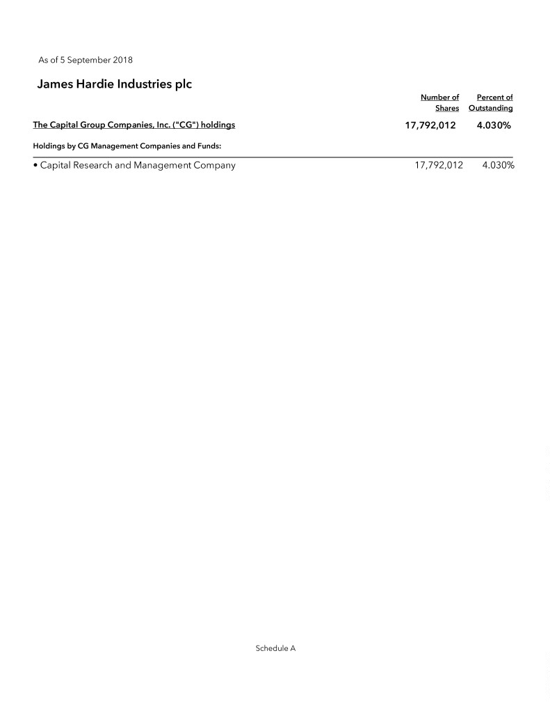 As of 5 September 2018 James Hardie Industries plc Number of Percent of Shares Outstanding The Capital Group Companies, Inc. ("CG") holdings 17,792,012 4.030% Holdings by CG Management Companies and Funds: • Capital Research and Management Company 17,792,012 4.030% Schedule A