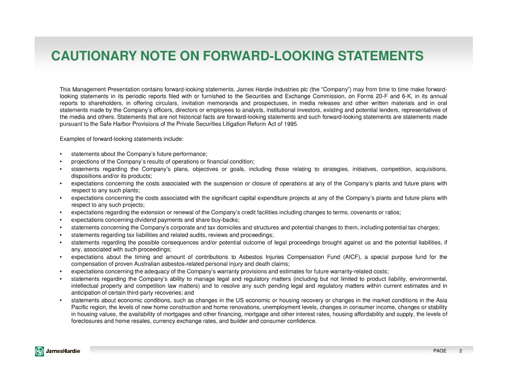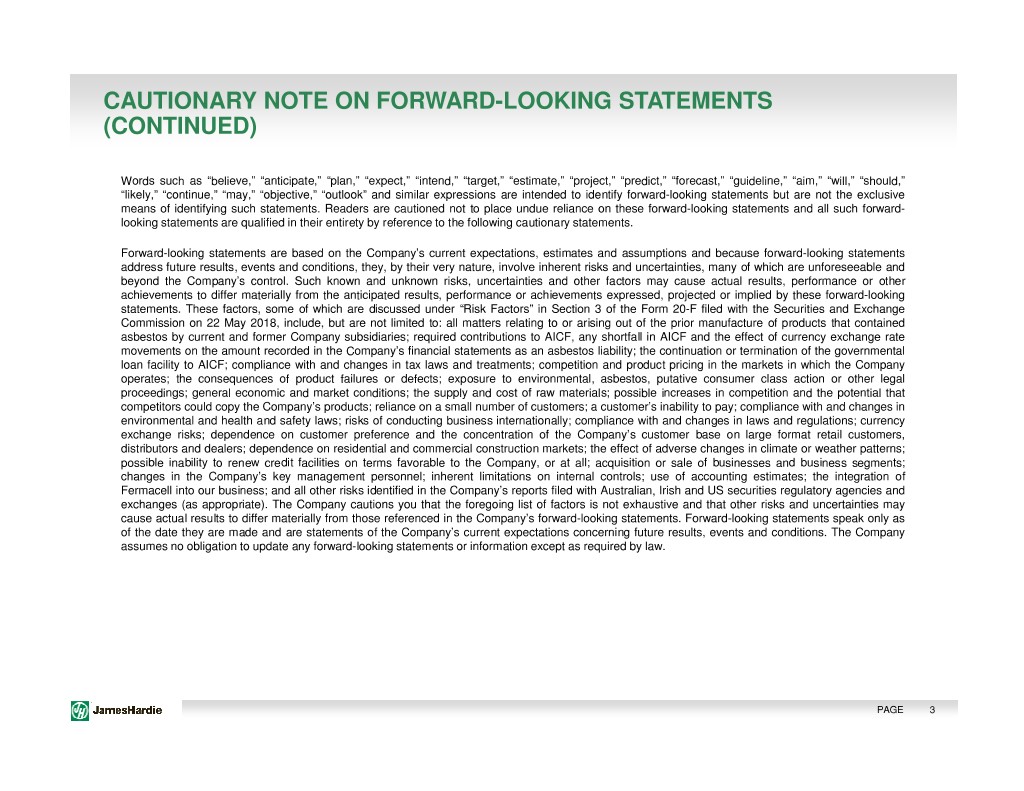 CAUTIONARY NOTE ON FORWARD-LOOKING STATEMENTS This Management Presentation contains forward-looking statements. James Hardie Industries plc (the “Company”) may from time to time make forward- looking statements in its periodic reports filed with or furnished to the Securities and Exchange Commission, on Forms 20-F and 6-K, in its annual reports to shareholders, in offering circulars, invitation memoranda and prospectuses, in media releases and other written materials and in oral statements made by the Company’s officers, directors or employees to analysts, institutional investors, existing and potential lenders, representatives of the media and others. Statements that are not historical facts are forward-looking statements and such forward-looking statements are statements made pursuant to the Safe Harbor Provisions of the Private Securities Litigation Reform Act of 1995. Examples of forward-looking statements include: • statements about the Company’s future performance; • projections of the Company’s results of operations or financial condition; • statements regarding the Company’s plans, objectives or goals, including those relating to strategies, initiatives, competition, acquisitions, dispositions and/or its products; • expectations concerning the costs associated with the suspension or closure of operations at any of the Company’s plants and future plans with respect to any such plants; • expectations concerning the costs associated with the significant capital expenditure projects at any of the Company’s plants and future plans with respect to any such projects; • expectations regarding the extension or renewal of the Company’s credit facilities including changes to terms, covenants or ratios; • expectations concerning dividend payments and share buy-backs; • statements concerning the Company’s corporate and tax domiciles and structures and potential changes to them, including potential tax charges; • statements regarding tax liabilities and related audits, reviews and proceedings; • statements regarding the possible consequences and/or potential outcome of legal proceedings brought against us and the potential liabilities, if any, associated with such proceedings; • expectations about the timing and amount of contributions to Asbestos Injuries Compensation Fund (AICF), a special purpose fund for the compensation of proven Australian asbestos-related personal injury and death claims; • expectations concerning the adequacy of the Company’s warranty provisions and estimates for future warranty-related costs; • statements regarding the Company’s ability to manage legal and regulatory matters (including but not limited to product liability, environmental, intellectual property and competition law matters) and to resolve any such pending legal and regulatory matters within current estimates and in anticipation of certain third-party recoveries; and • statements about economic conditions, such as changes in the US economic or housing recovery or changes in the market conditions in the Asia Pacific region, the levels of new home construction and home renovations, unemployment levels, changes in consumer income, changes or stability in housing values, the availability of mortgages and other financing, mortgage and other interest rates, housing affordability and supply, the levels of foreclosures and home resales, currency exchange rates, and builder and consumer confidence. PAGE 2