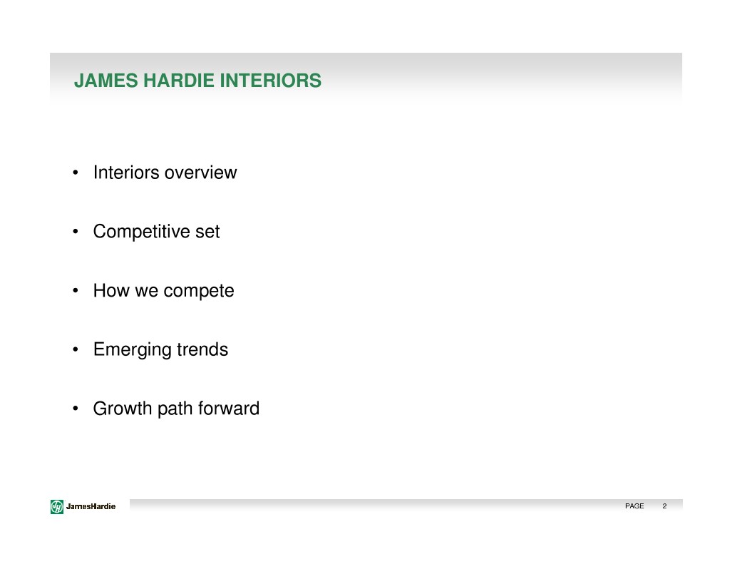 JAMES HARDIE INTERIORS • Interiors overview • Competitive set • How we compete • Emerging trends • Growth path forward PAGE 2