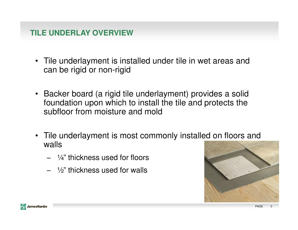 TILE UNDERLAY OVERVIEW • Tile underlayment is installed under tile in wet areas and can be rigid or non-rigid • Backer board (a rigid tile underlayment) provides a solid foundation upon which to install the tile and protects the subfloor from moisture and mold • Tile underlayment is most commonly installed on floors and walls ̶ ¼” thickness used for floors ̶ ½” thickness used for walls PAGE 3