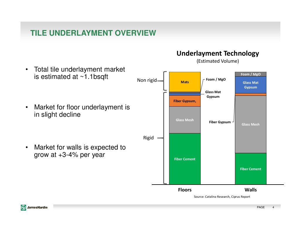 TILE UNDERLAYMENT OVERVIEW Underlayment Technology (Estimated Volume) • Total tile underlayment market Foam / MgO is estimated at ~1.1bsqft Foam / MgO Non rigid Mats Glass Mat Gypsum Glass Mat Gypsum Fiber Gypsum, • Market for floor underlayment is in slight decline Glass Mesh Fiber Gypsum Glass Mesh Rigid • Market for walls is expected to grow at +3-4% per year Fiber Cement Fiber Cement Floors Walls Source: Catalina Research, Ciprus Report PAGE 4