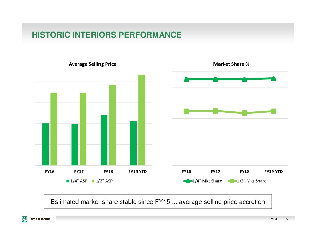 HISTORIC INTERIORS PERFORMANCE Average Selling Price Market Share % 60% 600 50% 550 40% 30% 500 20% 450 10% 400 0% FY16 FY17 FY18 FY19 YTD FY16 FY17 FY18 FY19 YTD 1/4" ASP 1/2" ASP 1/4" Mkt Share 1/2" Mkt Share Estimated market share stable since FY15 ... average selling price accretion PAGE 5