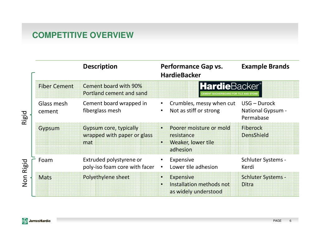 COMPETITIVE OVERVIEW Description Performance Gap vs. Example Brands HardieBacker Fiber Cement Cement board with 90% Portland cement and sand Glass mesh Cement board wrapped in • Crumbles, messy when cut USG – Durock cement fiberglass mesh • Not as stiff or strong National Gypsum - Permabase Rigid Gypsum Gypsum core, typically • Poorer moisture or mold Fiberock wrapped with paper or glass resistance DensShield mat • Weaker, lower tile adhesion Foam Extruded polystyrene or • Expensive Schluter Systems - poly-iso foam core with facer • Lower tile adhesion Kerdi Mats Polyethylene sheet • Expensive Schluter Systems - Non Rigid • Installation methods not Ditra as widely understood PAGE 6