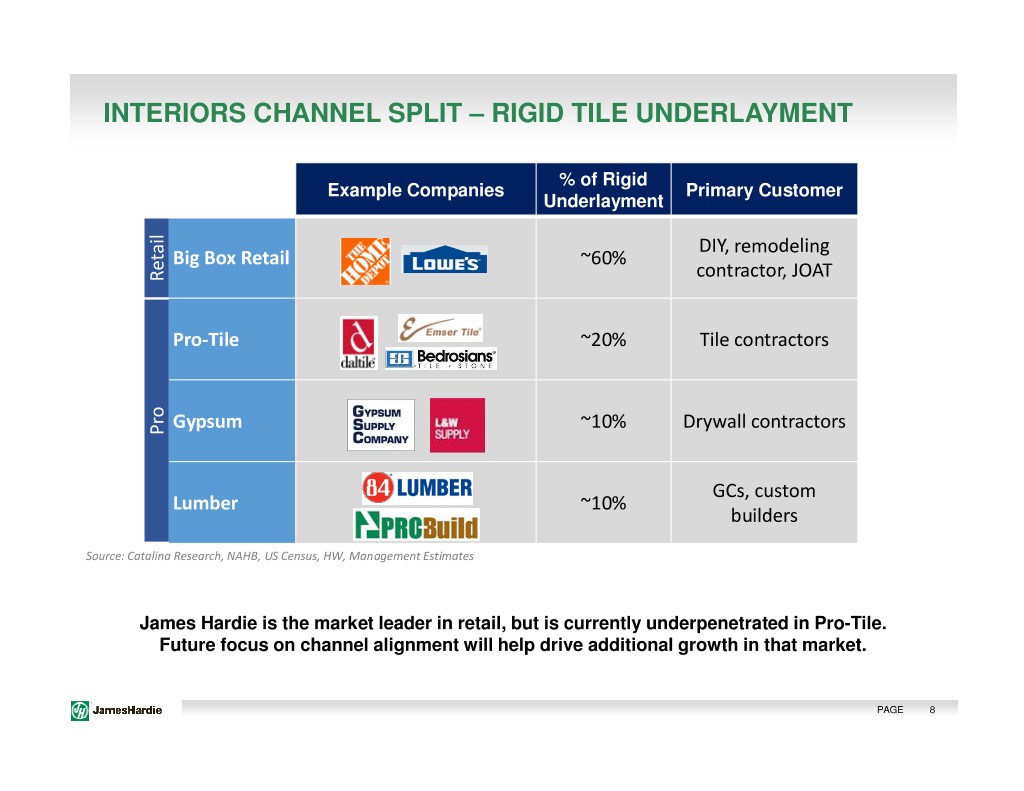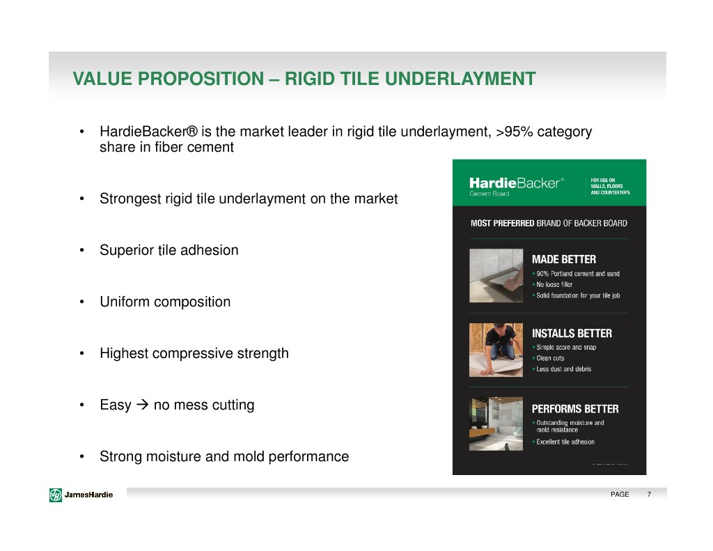 VALUE PROPOSITION – RIGID TILE UNDERLAYMENT • HardieBacker® is the market leader in rigid tile underlayment, >95% category share in fiber cement • Strongest rigid tile underlayment on the market • Superior tile adhesion • Uniform composition • Highest compressive strength • Easy no mess cutting • Strong moisture and mold performance PAGE 7