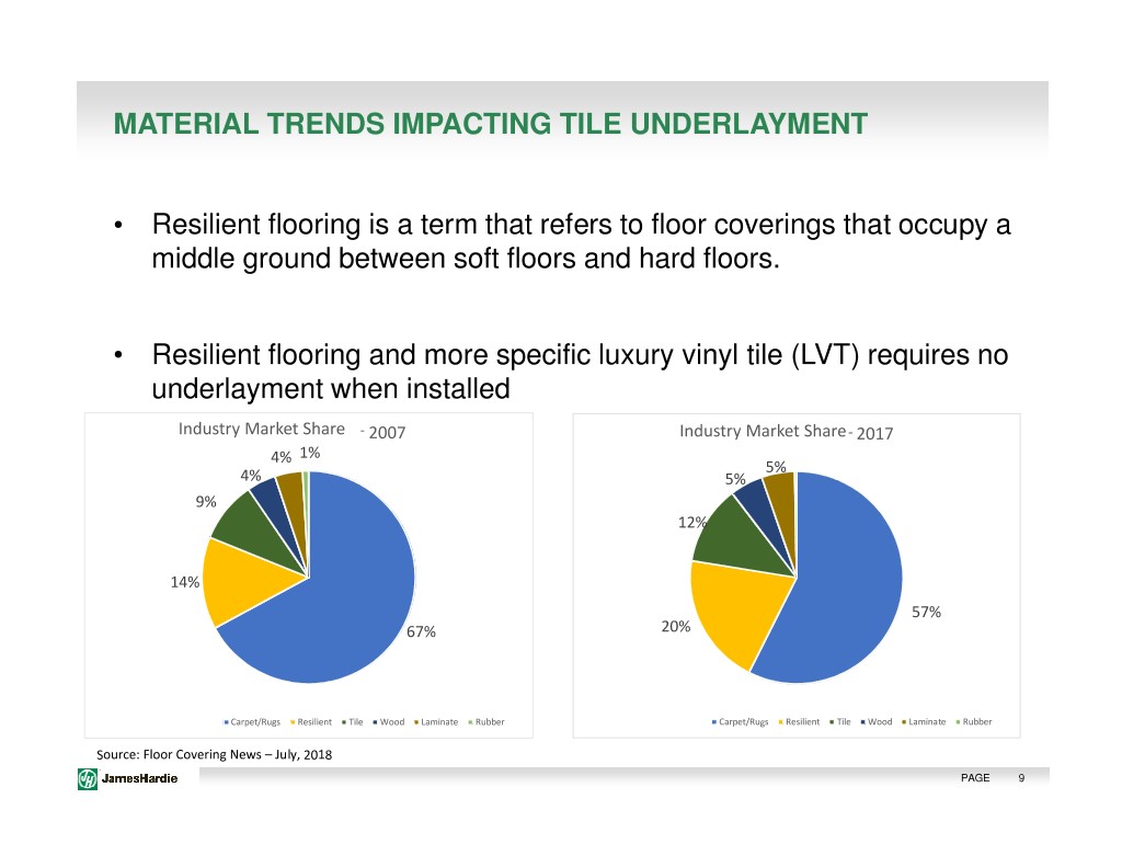 MATERIAL TRENDS IMPACTING TILE UNDERLAYMENT • Resilient flooring is a term that refers to floor coverings that occupy a middle ground between soft floors and hard floors. • Resilient flooring and more specific luxury vinyl tile (LVT) requires no underlayment when installed Industry Market Share - 2007 Industry Market Share - 2017 4% 1% 5% 4% 5% 9% 12% 14% 57% 67% 20% Carpet/Rugs Resilient Tile Wood Laminate Rubber Carpet/Rugs Resilient Tile Wood Laminate Rubber Source: Floor Covering News – July, 2018 PAGE 9
