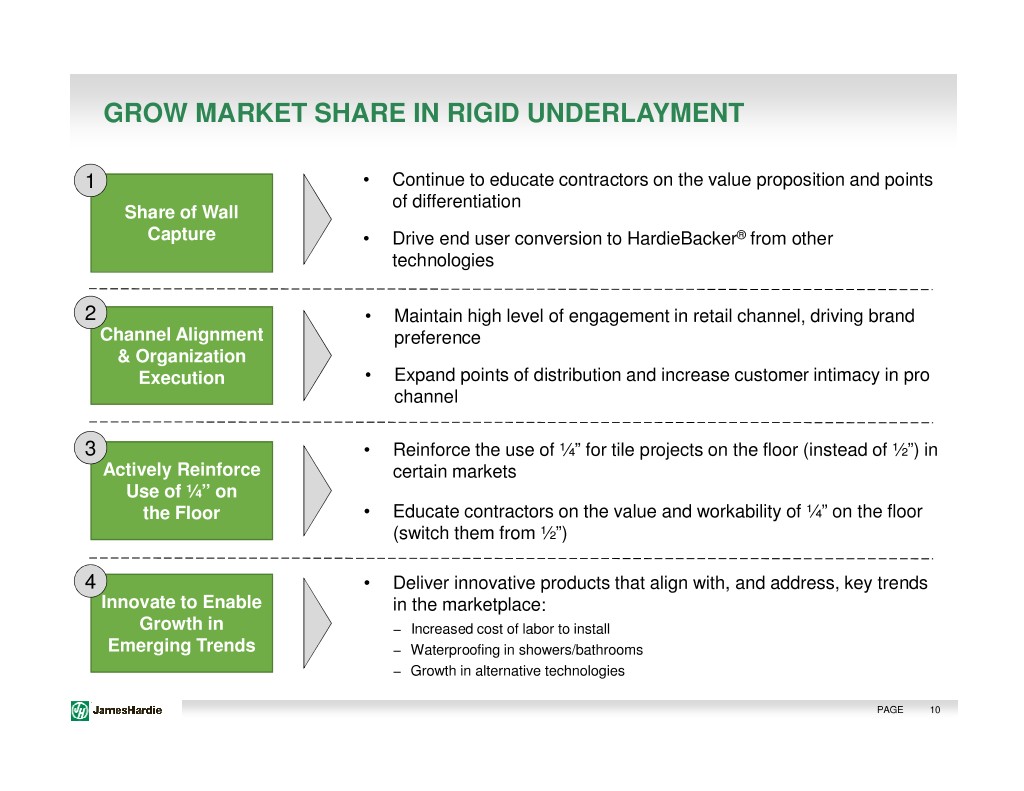 GROW MARKET SHARE IN RIGID UNDERLAYMENT 1 • Continue to educate contractors on the value proposition and points of differentiation Share of Wall Capture • Drive end user conversion to HardieBacker ® from other technologies 2 • Maintain high level of engagement in retail channel, driving brand Channel Alignment preference & Organization Execution • Expand points of distribution and increase customer intimacy in pro channel 3 • Reinforce the use of ¼” for tile projects on the floor (instead of ½”) in Actively Reinforce certain markets Use of ¼” on the Floor • Educate contractors on the value and workability of ¼” on the floor (switch them from ½”) 4 • Deliver innovative products that align with, and address, key trends Innovate to Enable in the marketplace: Growth in − Increased cost of labor to install Emerging Trends − Waterproofing in showers/bathrooms − Growth in alternative technologies PAGE 10