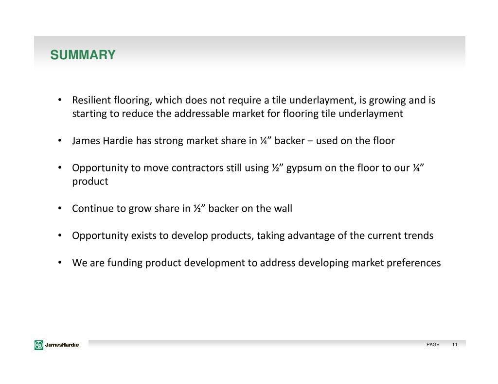 SUMMARY • Resilient flooring, which does not require a tile underlayment, is growing and is starting to reduce the addressable market for flooring tile underlayment • James Hardie has strong market share in ¼” backer – used on the floor • Opportunity to move contractors still using ½” gypsum on the floor to our ¼” product • Continue to grow share in ½” backer on the wall • Opportunity exists to develop products, taking advantage of the current trends • We are funding product development to address developing market preferences PAGE 11