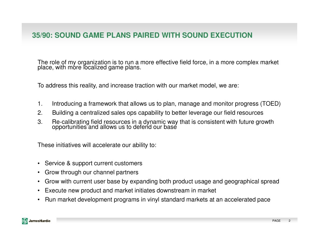 35/90: SOUND GAME PLANS PAIRED WITH SOUND EXECUTION The role of my organization is to run a more effective field force, in a more complex market place, with more localized game plans. To address this reality, and increase traction with our market model, we are: 1. Introducing a framework that allows us to plan, manage and monitor progress (TOED) 2. Building a centralized sales ops capability to better leverage our field resources 3. Re-calibrating field resources in a dynamic way that is consistent with future growth opportunities and allows us to defend our base These initiatives will accelerate our ability to: • Service & support current customers • Grow through our channel partners • Grow with current user base by expanding both product usage and geographical spread • Execute new product and market initiates downstream in market • Run market development programs in vinyl standard markets at an accelerated pace PAGE 2