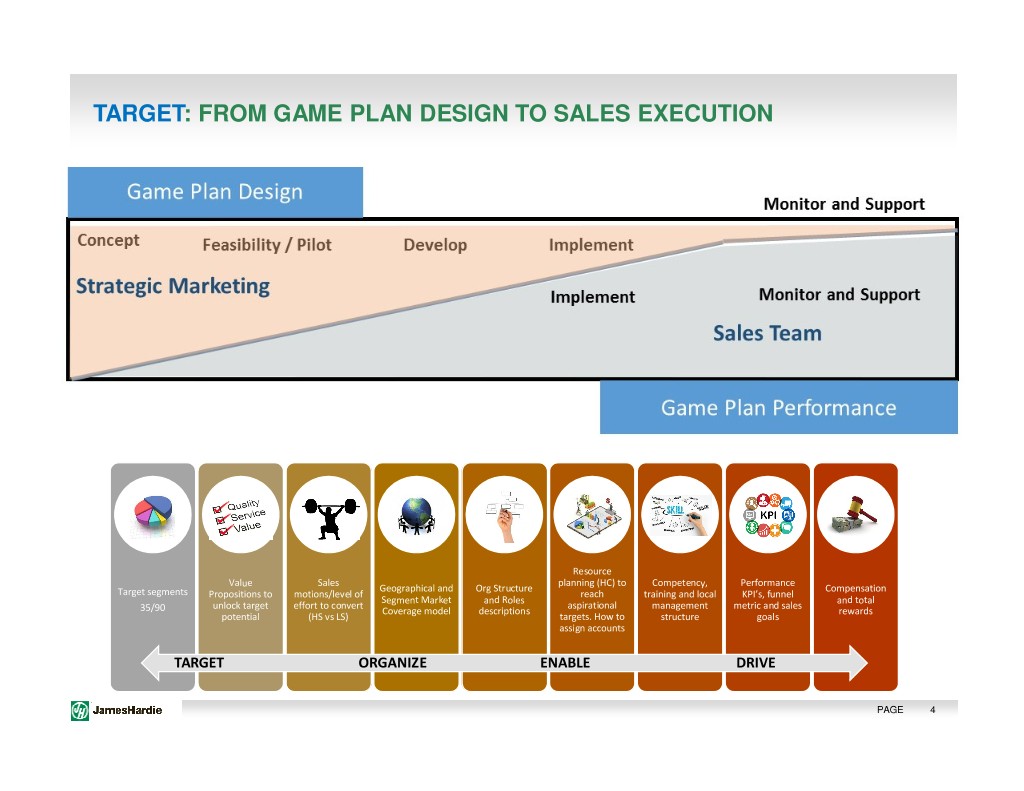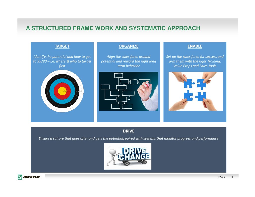 A STRUCTURED FRAME WORK AND SYSTEMATIC APPROACH TARGET ORGANIZE ENABLE Identify the potential and how to get Align the sales force around Set up the sales force for success and to 35/90 – i.e. where & who to target potential and reward the right long arm them with the right Training, first term behavior Value Props and Sales Tools DRIVE Ensure a culture that goes after and gets the potential, paired with systems that monitor progress and performance PAGE 3