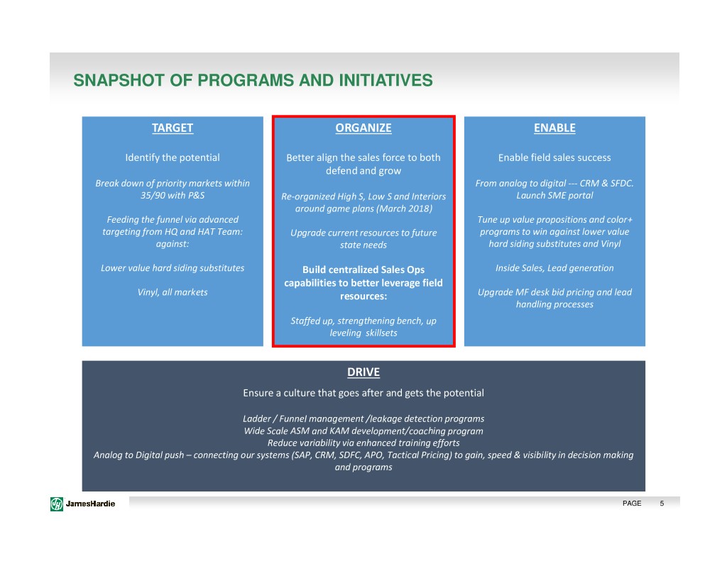 TARGET : FROM GAME PLAN DESIGN TO SALES EXECUTION Resource Value Sales planning (HC) to Competency, Performance Geographical and Org Structure Compensation Target segments Propositions to motions/level of reach training and local KPI’s, funnel Segment Market and Roles and total unlock target effort to convert aspirational management metric and sales 35/90 Coverage model descriptions rewards potential (HS vs LS) targets. How to structure goals assign accounts TARGET ORGANIZE ENABLE DRIVE PAGE 4