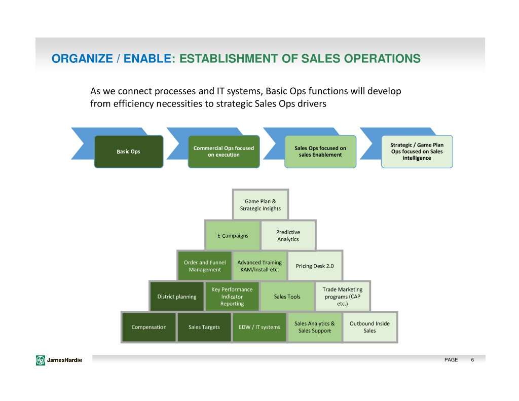ORGANIZE / ENABLE : ESTABLISHMENT OF SALES OPERATIONS As we connect processes and IT systems, Basic Ops functions will develop from efficiency necessities to strategic Sales Ops drivers Strategic / Game Plan Commercial Ops focused Sales Ops focused on Basic Ops Ops focused on Sales on execution sales Enablement intelligence Game Plan & Strategic Insights Predictive E-Campaigns Analytics Order and Funnel Advanced Training Pricing Desk 2.0 Management KAM/Install etc. Key Performance Trade Marketing District planning Indicator Sales Tools programs (CAP Reporting etc.) Sales Analytics & Outbound Inside Compensation Sales Targets EDW / IT systems Sales Support Sales PAGE 6