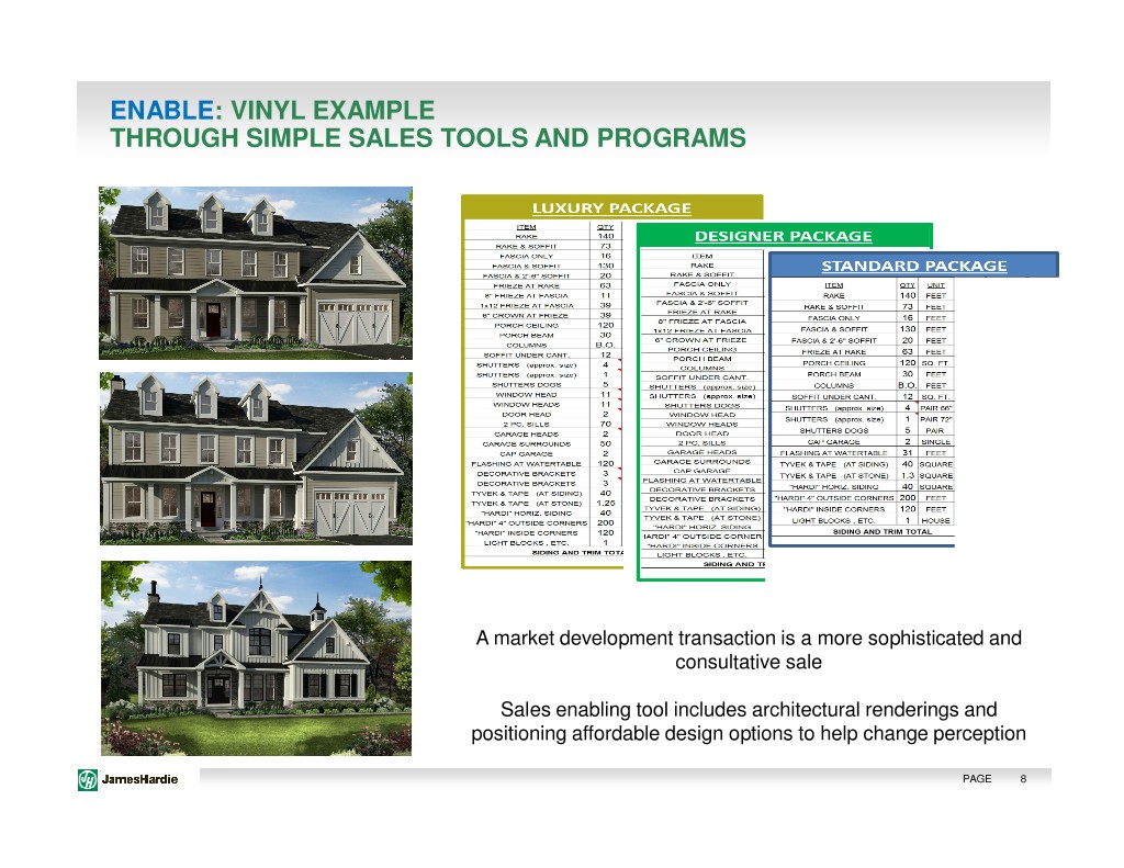ENABLE : VINYL EXAMPLE THROUGH SIMPLE SALES TOOLS AND PROGRAMS A market development transaction is a more sophisticated and consultative sale Sales enabling tool includes architectural renderings and positioning affordable design options to help change perception PAGE 8