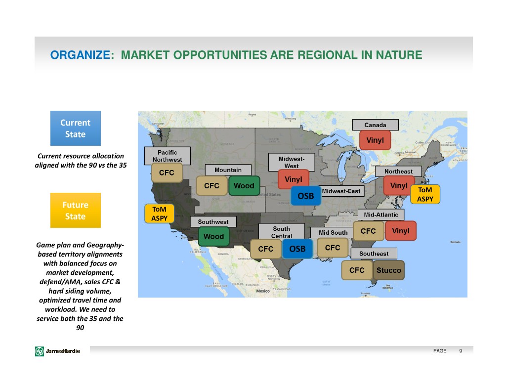 ORGANIZE : MARKET OPPORTUNITIES ARE REGIONAL IN NATURE Current State Current resource allocation aligned with the 90 vs the 35 ToM OSB ASPY Future ToM State ASPY Game plan and Geography- OSB based territory alignments with balanced focus on market development, defend/AMA, sales CFC & hard siding volume, optimized travel time and workload. We need to service both the 35 and the 90 PAGE 9