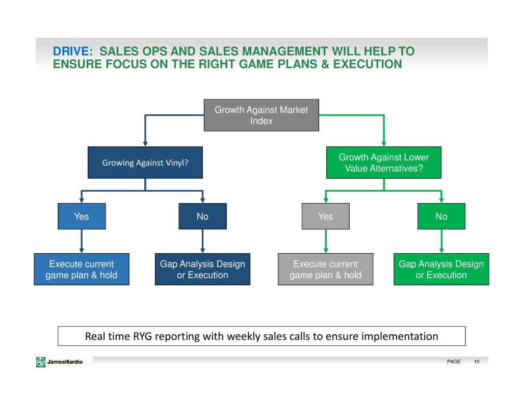 DRIVE : SALES OPS AND SALES MANAGEMENT WILL HELP TO ENSURE FOCUS ON THE RIGHT GAME PLANS & EXECUTION Growth Against Market Index Growth Against Lower Growing Against Vinyl? Value Alternatives? Yes No Yes No Execute current Gap Analysis Design Execute current Gap Analysis Design game plan & hold or Execution game plan & hold or Execution Real time RYG reporting with weekly sales calls to ensure implementation PAGE 10