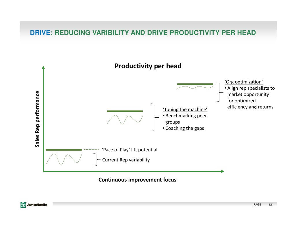 DRIVE : REDUCING VARIBILITY AND DRIVE PRODUCTIVITY PER HEAD Productivity per head ‘Org optimization’ • Align rep specialists to market opportunity for optimized ‘Tuning the machine’ efficiency and returns • Benchmarking peer groups • Coaching the gaps Sales Rep performance Rep Sales ‘Pace of Play’ lift potential Current Rep variability Continuous improvement focus PAGE 12
