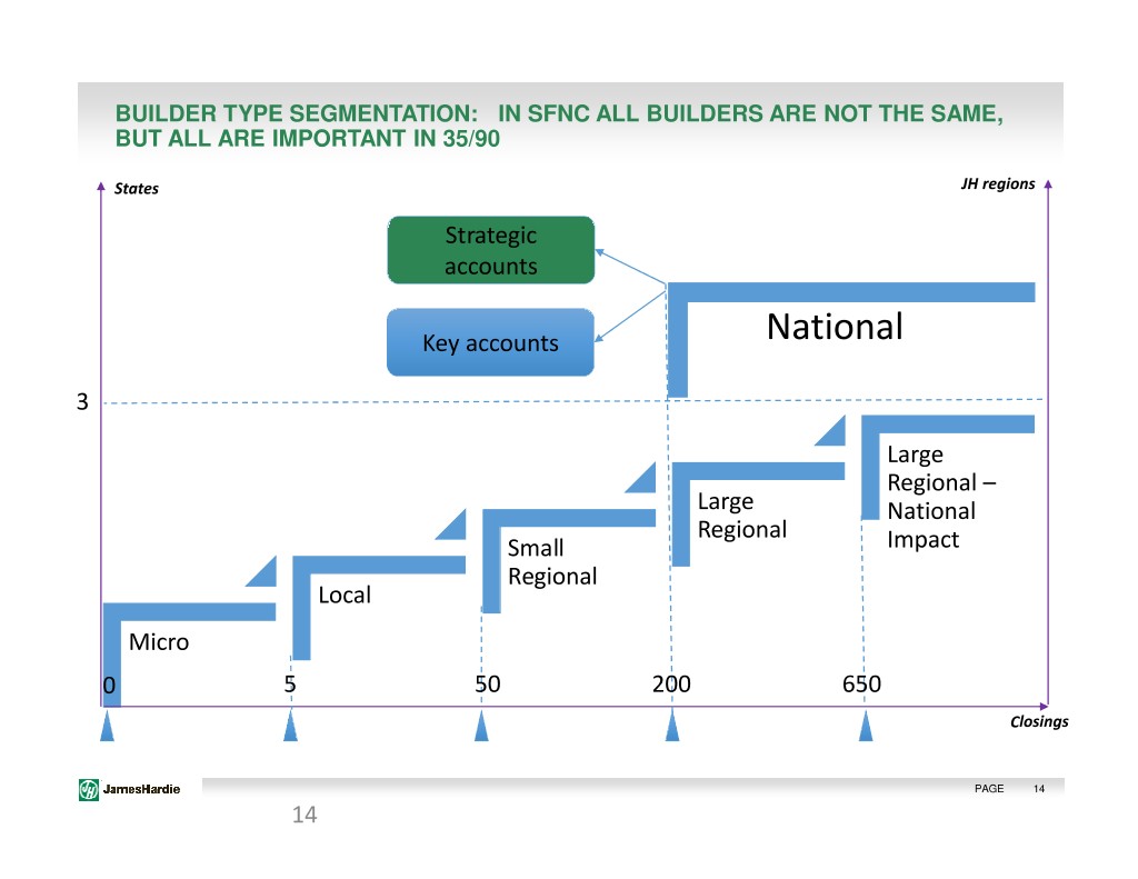 BUILDER TYPE SEGMENTATION: IN SFNC ALL BUILDERS ARE NOT THE SAME, BUT ALL ARE IMPORTANT IN 35/90 States JH regions Strategic accounts Key accounts National 3 Large Regional – Large National Regional Small Impact Regional Local Micro 0 5 50 200 650 Closings PAGE 14 14