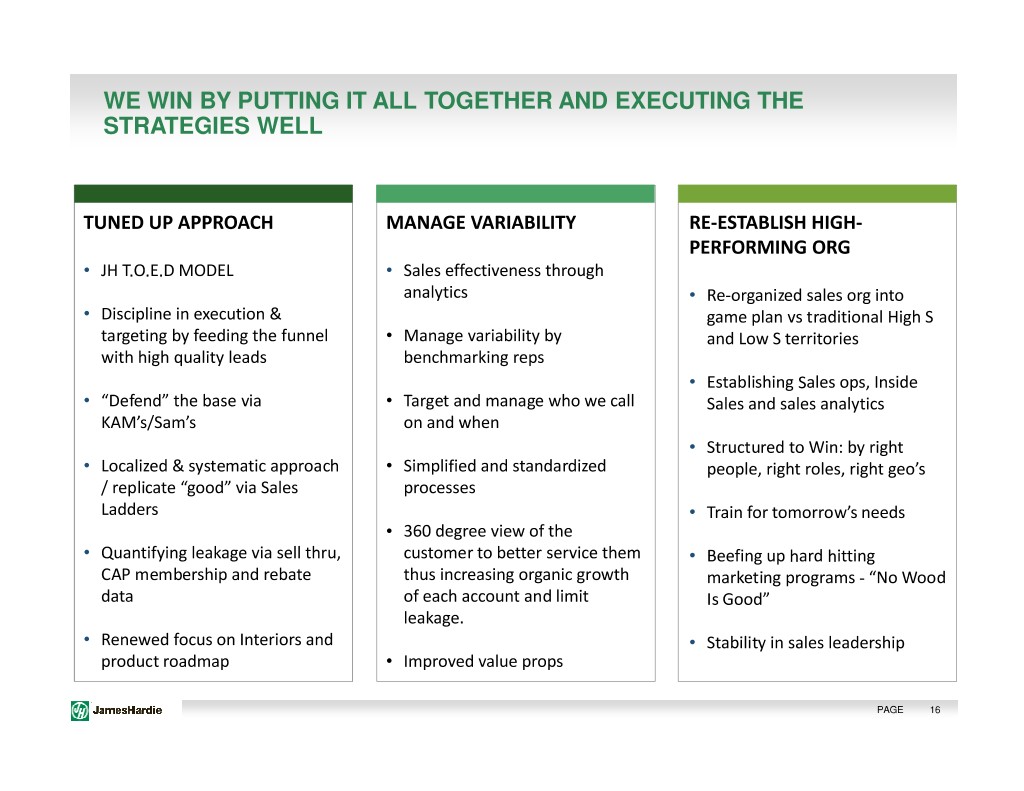 WE WIN BY PUTTING IT ALL TOGETHER AND EXECUTING THE STRATEGIES WELL TUNED UP APPROACH MANAGE VARIABILITY RE-ESTABLISH HIGH- PERFORMING ORG • JH T.O.E.D MODEL • Sales effectiveness through analytics • Re-organized sales org into • Discipline in execution & game plan vs traditional High S targeting by feeding the funnel • Manage variability by and Low S territories with high quality leads benchmarking reps • Establishing Sales ops, Inside • “Defend” the base via • Target and manage who we call Sales and sales analytics KAM’s/Sam’s on and when • Structured to Win: by right • Localized & systematic approach • Simplified and standardized people, right roles, right geo’s / replicate “good” via Sales processes Ladders • Train for tomorrow’s needs • 360 degree view of the • Quantifying leakage via sell thru, customer to better service them • Beefing up hard hitting CAP membership and rebate thus increasing organic growth marketing programs - “No Wood data of each account and limit Is Good” leakage. • Renewed focus on Interiors and • Stability in sales leadership product roadmap • Improved value props PAGE 16
