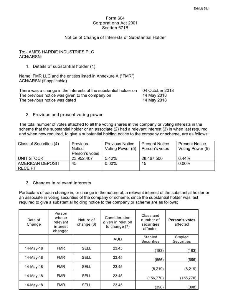 Exhibit 99.1 Form 604 Corporations Act 2001 Section 671B Notice of Change of Interests of Substantial Holder To: JAMES HARDIE INDUSTRIES PLC ACN/ARSN: 1. Details of substantial holder (1) Name: FMR LLC and the entities listed in Annexure A (“FMR”) ACN/ARSN (if applicable) There was a change in the interests of the substantial holder on 04 October 2018 The previous notice was given to the company on 14 May 2018 The previous notice was dated 14 May 2018 2. Previous and present voting power The total number of votes attached to all the voting shares in the company or voting interests in the scheme that the substantial holder or an associate (2) had a relevant interest (3) in when last required, and when now required, to give a substantial holding notice to the company or scheme, are as follows: Class of Securities (4) Previous Previous Notice Present Notice Present Notice Notice Voting Power (5) Person’s votes Voting Power (5) Person’s votes UNIT STOCK 23,952,407 5.42% 28,467,500 6.44% AMERICAN DEPOSIT 45 0.00% 15 0.00% RECEIPT 3. Changes in relevant interests Particulars of each change in, or change in the nature of, a relevant interest of the substantial holder or an associate in voting securities of the company or scheme, since the substantial holder was last required to give a substantial holding notice to the company or scheme are as follows: Person Class and whose Consideration Date of Nature of number of Person’s votes relevant given in relation Change change (6) securities affected interest to change (7) affected changed Stapled Stapled AUD Securities Securities 14-May-18 FMR SELL 23.45 (183) (183) 14-May-18 FMR SELL 23.45 (666) (666) 14-May-18 FMR SELL 23.45 (8,219) (8,219) 14-May-18 FMR SELL 23.45 (156,770) (156,770) 14-May-18 FMR SELL 23.45 (398) (398)