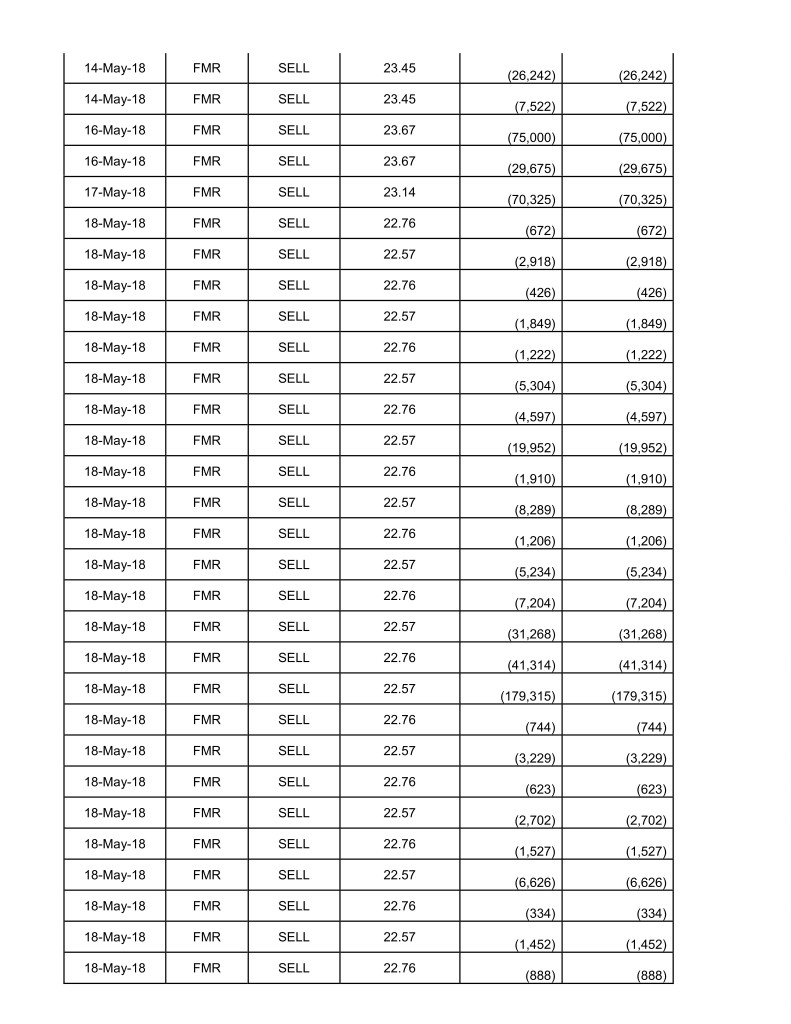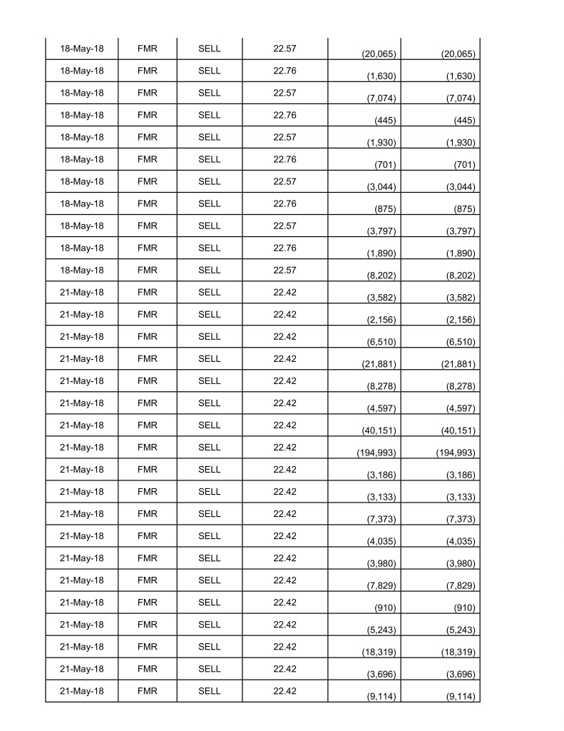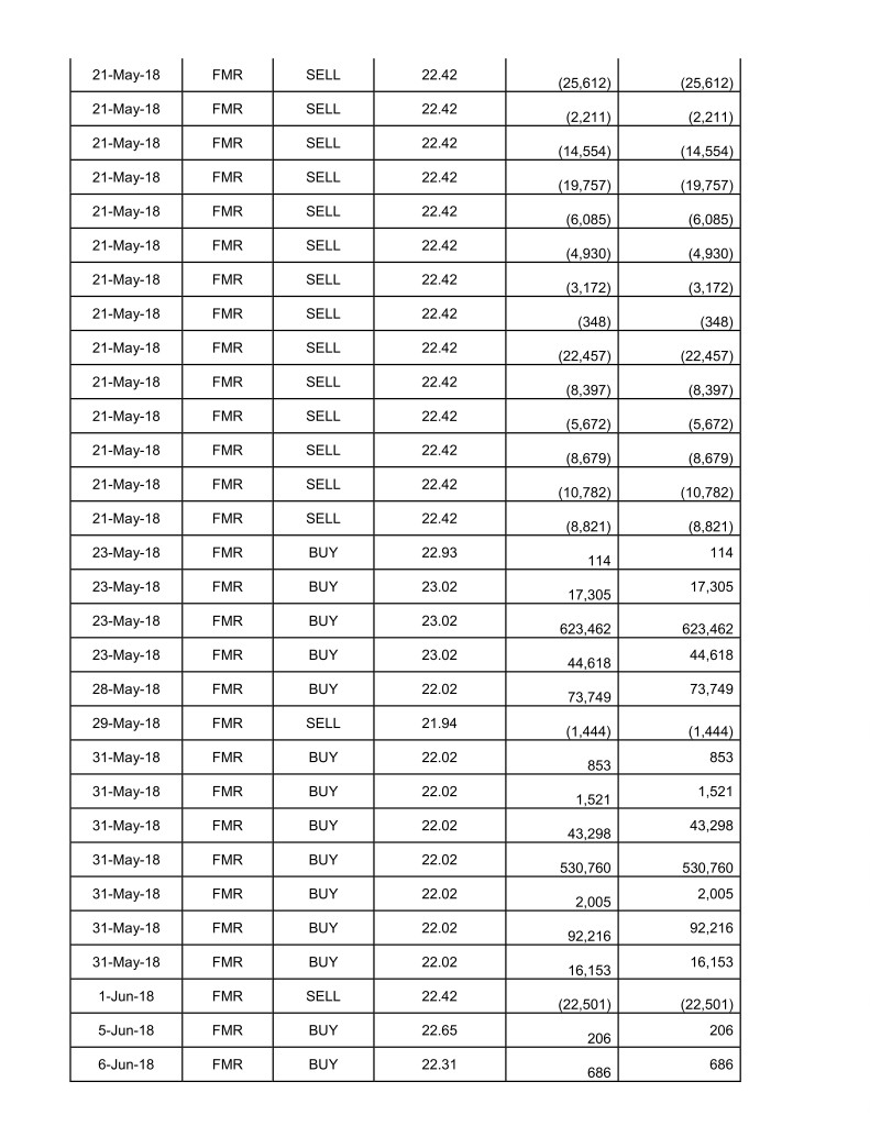 18-May-18 FMR SELL 22.57 (3,852) (3,852) 18-May-18 FMR SELL 22.76 (3,564) (3,564) 18-May-18 FMR SELL 22.57 (15,471) (15,471) 18-May-18 FMR SELL 22.76 (293) (293) 18-May-18 FMR SELL 22.57 (963) (963) 18-May-18 FMR SELL 22.76 (439) (439) 18-May-18 FMR SELL 22.57 (1,905) (1,905) 18-May-18 FMR SELL 22.76 (1,446) (1,446) 18-May-18 FMR SELL 22.57 (6,278) (6,278) 18-May-18 FMR SELL 22.76 (326) (326) 18-May-18 FMR SELL 22.57 (1,413) (1,413) 18-May-18 FMR SELL 22.76 (691) (691) 18-May-18 FMR SELL 22.57 (2,997) (2,997) 18-May-18 FMR SELL 22.76 (1,809) (1,809) 18-May-18 FMR SELL 22.57 (7,851) (7,851) 18-May-18 FMR SELL 22.76 (433) (433) 18-May-18 FMR SELL 22.57 (1,881) (1,881) 18-May-18 FMR SELL 22.76 (2,710) (2,710) 18-May-18 FMR SELL 22.57 (11,764) (11,764) 18-May-18 FMR SELL 22.76 (3,581) (3,581) 18-May-18 FMR SELL 22.57 (15,542) (15,542) 18-May-18 FMR SELL 22.76 (1,251) (1,251) 18-May-18 FMR SELL 22.57 (5,432) (5,432) 18-May-18 FMR SELL 22.76 (946) (946) 18-May-18 FMR SELL 22.57 (4,108) (4,108) 18-May-18 FMR SELL 22.76 (635) (635) 18-May-18 FMR SELL 22.57 (2,756) (2,756) 18-May-18 FMR SELL 22.76 (293) (293) 18-May-18 FMR SELL 22.57 (360) (360) 18-May-18 FMR SELL 22.76 (4,623) (4,623)