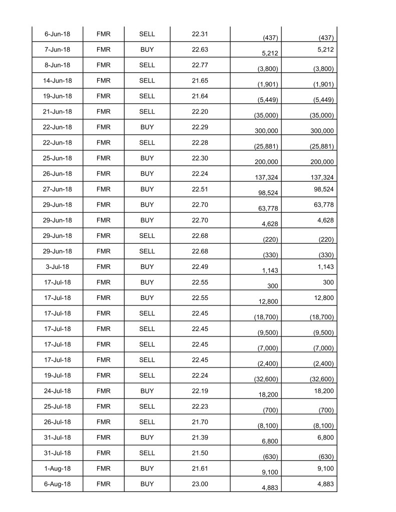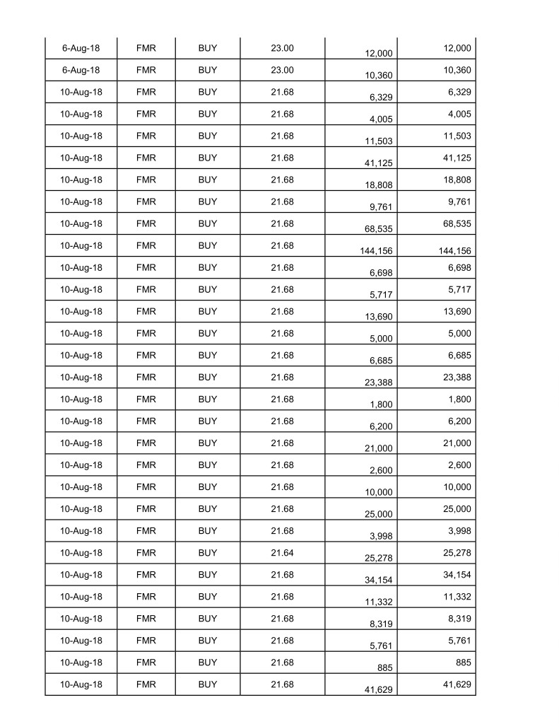 6-Aug-18 FMR BUY 23.00 12,000 12,000 6-Aug-18 FMR BUY 23.00 10,360 10,360 10-Aug-18 FMR BUY 21.68 6,329 6,329 10-Aug-18 FMR BUY 21.68 4,005 4,005 10-Aug-18 FMR BUY 21.68 11,503 11,503 10-Aug-18 FMR BUY 21.68 41,125 41,125 10-Aug-18 FMR BUY 21.68 18,808 18,808 10-Aug-18 FMR BUY 21.68 9,761 9,761 10-Aug-18 FMR BUY 21.68 68,535 68,535 10-Aug-18 FMR BUY 21.68 144,156 144,156 10-Aug-18 FMR BUY 21.68 6,698 6,698 10-Aug-18 FMR BUY 21.68 5,717 5,717 10-Aug-18 FMR BUY 21.68 13,690 13,690 10-Aug-18 FMR BUY 21.68 5,000 5,000 10-Aug-18 FMR BUY 21.68 6,685 6,685 10-Aug-18 FMR BUY 21.68 23,388 23,388 10-Aug-18 FMR BUY 21.68 1,800 1,800 10-Aug-18 FMR BUY 21.68 6,200 6,200 10-Aug-18 FMR BUY 21.68 21,000 21,000 10-Aug-18 FMR BUY 21.68 2,600 2,600 10-Aug-18 FMR BUY 21.68 10,000 10,000 10-Aug-18 FMR BUY 21.68 25,000 25,000 10-Aug-18 FMR BUY 21.68 3,998 3,998 10-Aug-18 FMR BUY 21.64 25,278 25,278 10-Aug-18 FMR BUY 21.68 34,154 34,154 10-Aug-18 FMR BUY 21.68 11,332 11,332 10-Aug-18 FMR BUY 21.68 8,319 8,319 10-Aug-18 FMR BUY 21.68 5,761 5,761 10-Aug-18 FMR BUY 21.68 885 885 10-Aug-18 FMR BUY 21.68 41,629 41,629