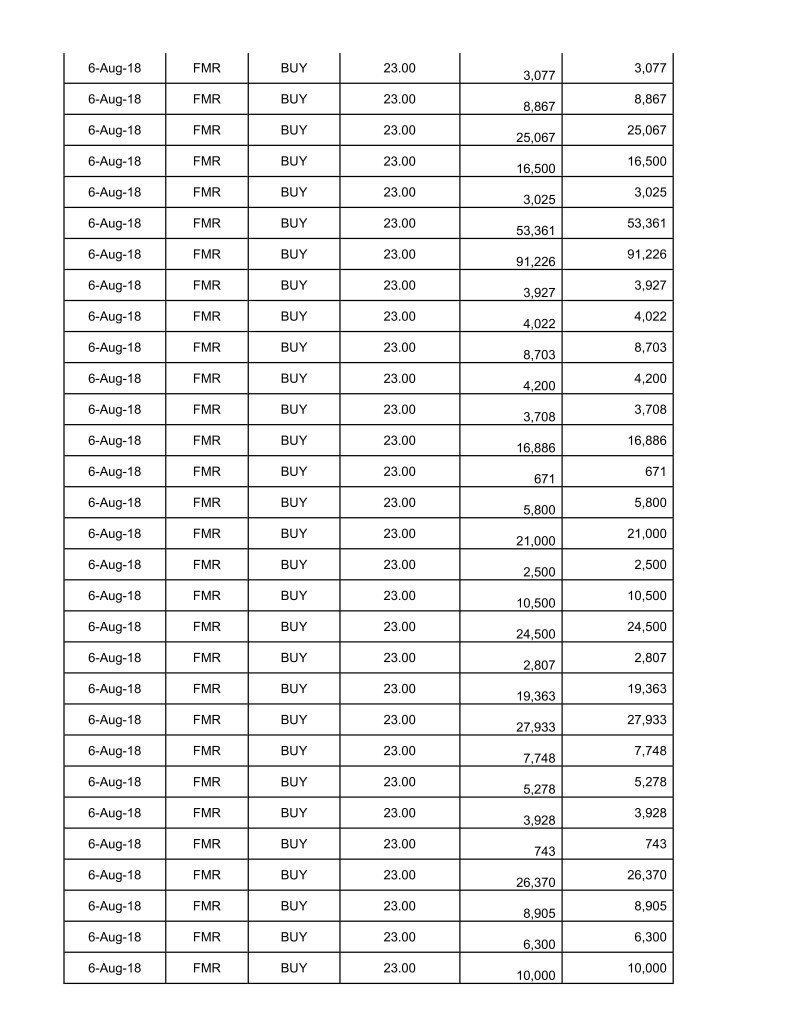6-Aug-18 FMR BUY 23.00 3,077 3,077 6-Aug-18 FMR BUY 23.00 8,867 8,867 6-Aug-18 FMR BUY 23.00 25,067 25,067 6-Aug-18 FMR BUY 23.00 16,500 16,500 6-Aug-18 FMR BUY 23.00 3,025 3,025 6-Aug-18 FMR BUY 23.00 53,361 53,361 6-Aug-18 FMR BUY 23.00 91,226 91,226 6-Aug-18 FMR BUY 23.00 3,927 3,927 6-Aug-18 FMR BUY 23.00 4,022 4,022 6-Aug-18 FMR BUY 23.00 8,703 8,703 6-Aug-18 FMR BUY 23.00 4,200 4,200 6-Aug-18 FMR BUY 23.00 3,708 3,708 6-Aug-18 FMR BUY 23.00 16,886 16,886 6-Aug-18 FMR BUY 23.00 671 671 6-Aug-18 FMR BUY 23.00 5,800 5,800 6-Aug-18 FMR BUY 23.00 21,000 21,000 6-Aug-18 FMR BUY 23.00 2,500 2,500 6-Aug-18 FMR BUY 23.00 10,500 10,500 6-Aug-18 FMR BUY 23.00 24,500 24,500 6-Aug-18 FMR BUY 23.00 2,807 2,807 6-Aug-18 FMR BUY 23.00 19,363 19,363 6-Aug-18 FMR BUY 23.00 27,933 27,933 6-Aug-18 FMR BUY 23.00 7,748 7,748 6-Aug-18 FMR BUY 23.00 5,278 5,278 6-Aug-18 FMR BUY 23.00 3,928 3,928 6-Aug-18 FMR BUY 23.00 743 743 6-Aug-18 FMR BUY 23.00 26,370 26,370 6-Aug-18 FMR BUY 23.00 8,905 8,905 6-Aug-18 FMR BUY 23.00 6,300 6,300 6-Aug-18 FMR BUY 23.00 10,000 10,000