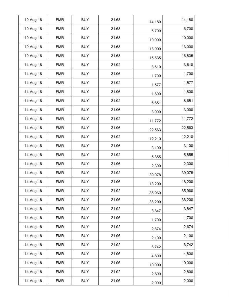 10-Aug-18 FMR BUY 21.68 14,180 14,180 10-Aug-18 FMR BUY 21.68 6,700 6,700 10-Aug-18 FMR BUY 21.68 10,000 10,000 10-Aug-18 FMR BUY 21.68 13,000 13,000 10-Aug-18 FMR BUY 21.68 16,835 16,835 14-Aug-18 FMR BUY 21.92 3,610 3,610 14-Aug-18 FMR BUY 21.96 1,700 1,700 14-Aug-18 FMR BUY 21.92 1,577 1,577 14-Aug-18 FMR BUY 21.96 1,800 1,800 14-Aug-18 FMR BUY 21.92 6,651 6,651 14-Aug-18 FMR BUY 21.96 3,000 3,000 14-Aug-18 FMR BUY 21.92 11,772 11,772 14-Aug-18 FMR BUY 21.96 22,563 22,563 14-Aug-18 FMR BUY 21.92 12,210 12,210 14-Aug-18 FMR BUY 21.96 3,100 3,100 14-Aug-18 FMR BUY 21.92 5,855 5,855 14-Aug-18 FMR BUY 21.96 2,300 2,300 14-Aug-18 FMR BUY 21.92 39,078 39,078 14-Aug-18 FMR BUY 21.96 18,200 18,200 14-Aug-18 FMR BUY 21.92 85,960 85,960 14-Aug-18 FMR BUY 21.96 36,200 36,200 14-Aug-18 FMR BUY 21.92 3,847 3,847 14-Aug-18 FMR BUY 21.96 1,700 1,700 14-Aug-18 FMR BUY 21.92 2,674 2,674 14-Aug-18 FMR BUY 21.96 2,100 2,100 14-Aug-18 FMR BUY 21.92 6,742 6,742 14-Aug-18 FMR BUY 21.96 4,800 4,800 14-Aug-18 FMR BUY 21.96 10,000 10,000 14-Aug-18 FMR BUY 21.92 2,800 2,800 14-Aug-18 FMR BUY 21.96 2,000 2,000