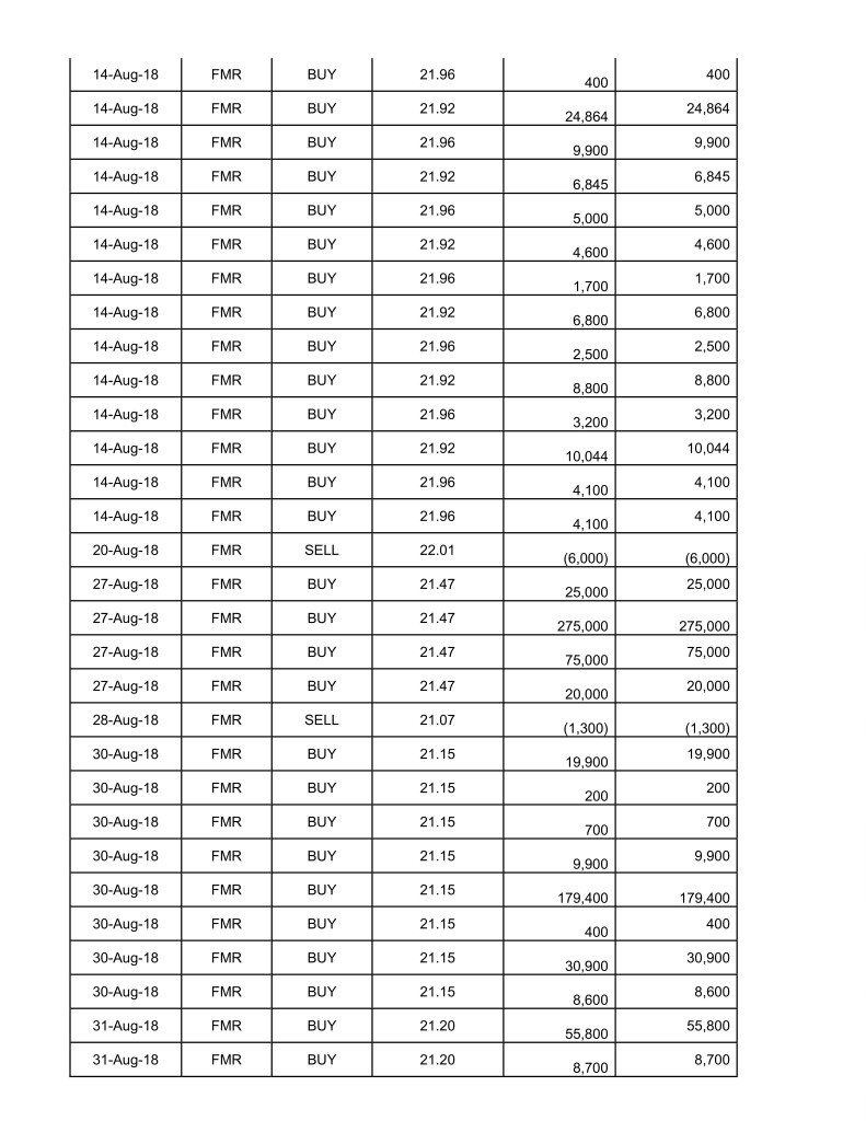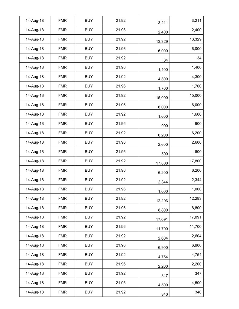 14-Aug-18 FMR BUY 21.92 3,211 3,211 14-Aug-18 FMR BUY 21.96 2,400 2,400 14-Aug-18 FMR BUY 21.92 13,329 13,329 14-Aug-18 FMR BUY 21.96 6,000 6,000 14-Aug-18 FMR BUY 21.92 34 34 14-Aug-18 FMR BUY 21.96 1,400 1,400 14-Aug-18 FMR BUY 21.92 4,300 4,300 14-Aug-18 FMR BUY 21.96 1,700 1,700 14-Aug-18 FMR BUY 21.92 15,000 15,000 14-Aug-18 FMR BUY 21.96 6,000 6,000 14-Aug-18 FMR BUY 21.92 1,600 1,600 14-Aug-18 FMR BUY 21.96 900 900 14-Aug-18 FMR BUY 21.92 6,200 6,200 14-Aug-18 FMR BUY 21.96 2,600 2,600 14-Aug-18 FMR BUY 21.96 500 500 14-Aug-18 FMR BUY 21.92 17,800 17,800 14-Aug-18 FMR BUY 21.96 6,200 6,200 14-Aug-18 FMR BUY 21.92 2,344 2,344 14-Aug-18 FMR BUY 21.96 1,000 1,000 14-Aug-18 FMR BUY 21.92 12,293 12,293 14-Aug-18 FMR BUY 21.96 8,800 8,800 14-Aug-18 FMR BUY 21.92 17,091 17,091 14-Aug-18 FMR BUY 21.96 11,700 11,700 14-Aug-18 FMR BUY 21.92 2,604 2,604 14-Aug-18 FMR BUY 21.96 6,900 6,900 14-Aug-18 FMR BUY 21.92 4,754 4,754 14-Aug-18 FMR BUY 21.96 2,200 2,200 14-Aug-18 FMR BUY 21.92 347 347 14-Aug-18 FMR BUY 21.96 4,500 4,500 14-Aug-18 FMR BUY 21.92 340 340