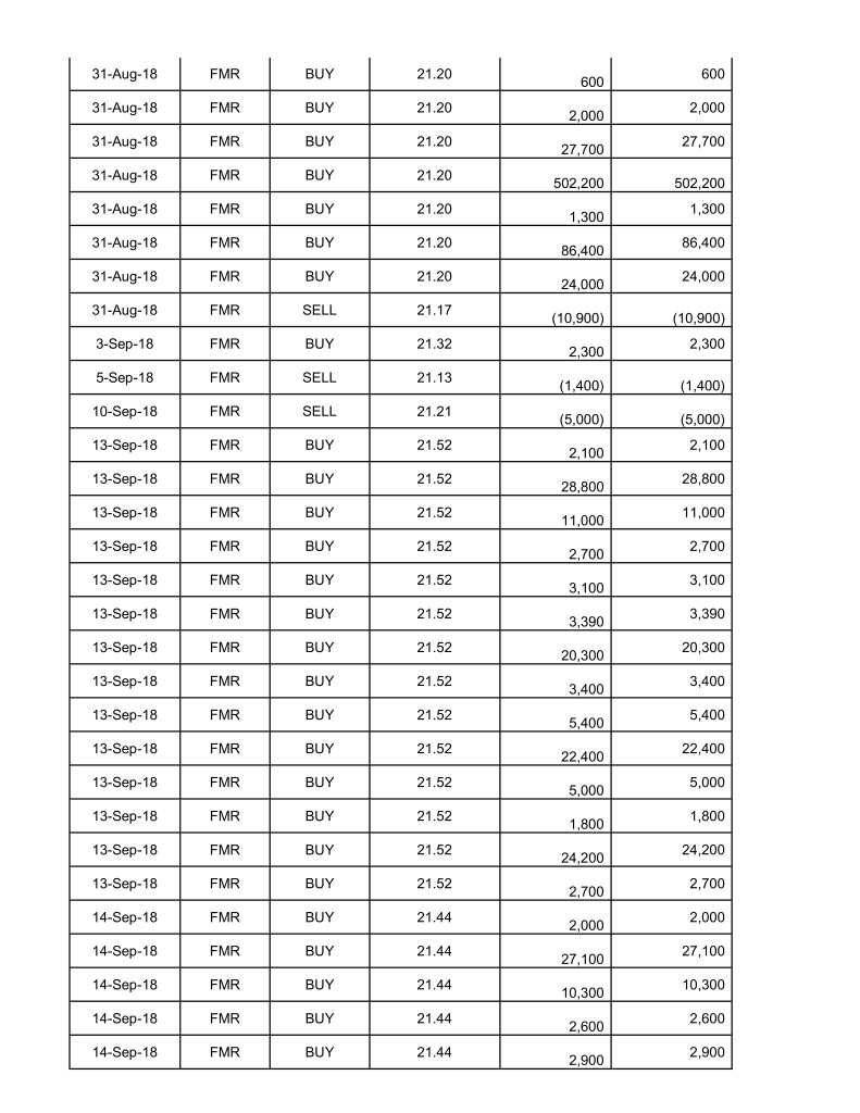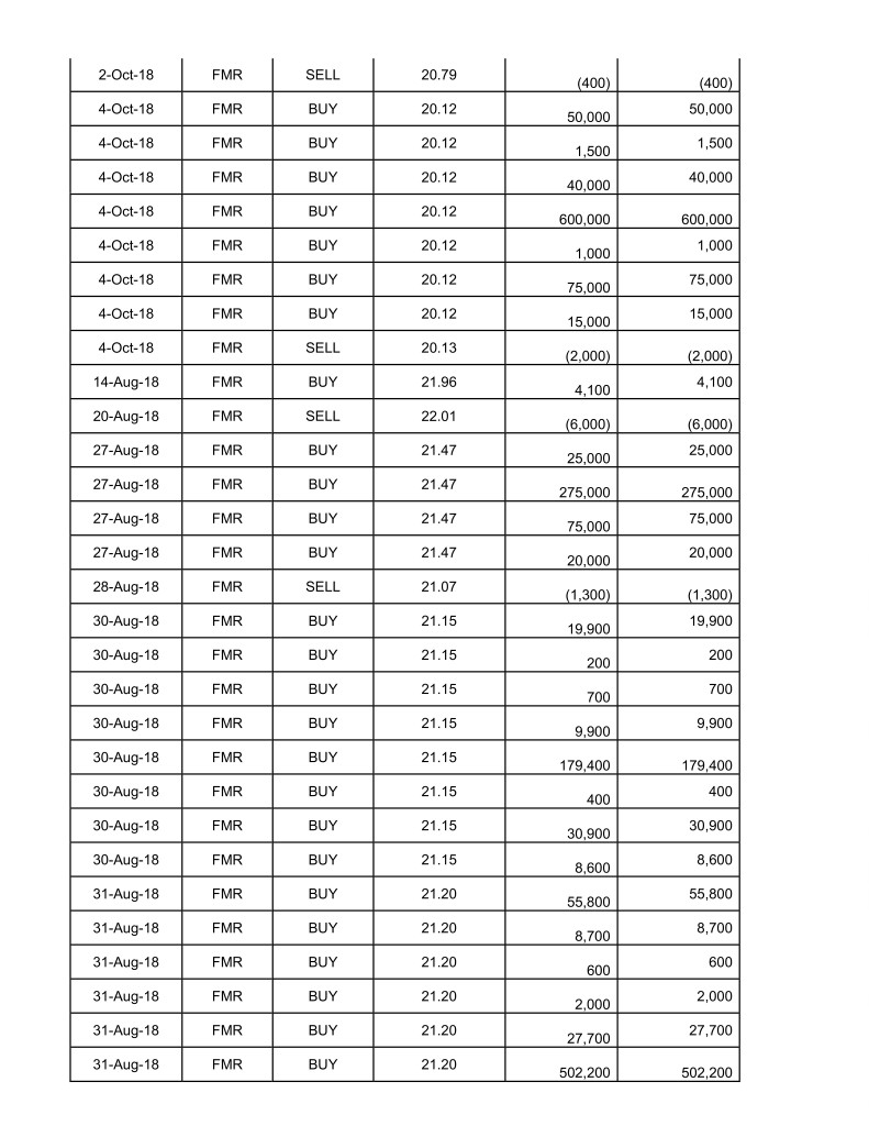 14-Aug-18 FMR BUY 21.96 400 400 14-Aug-18 FMR BUY 21.92 24,864 24,864 14-Aug-18 FMR BUY 21.96 9,900 9,900 14-Aug-18 FMR BUY 21.92 6,845 6,845 14-Aug-18 FMR BUY 21.96 5,000 5,000 14-Aug-18 FMR BUY 21.92 4,600 4,600 14-Aug-18 FMR BUY 21.96 1,700 1,700 14-Aug-18 FMR BUY 21.92 6,800 6,800 14-Aug-18 FMR BUY 21.96 2,500 2,500 14-Aug-18 FMR BUY 21.92 8,800 8,800 14-Aug-18 FMR BUY 21.96 3,200 3,200 14-Aug-18 FMR BUY 21.92 10,044 10,044 14-Aug-18 FMR BUY 21.96 4,100 4,100 14-Aug-18 FMR BUY 21.96 4,100 4,100 20-Aug-18 FMR SELL 22.01 (6,000) (6,000) 27-Aug-18 FMR BUY 21.47 25,000 25,000 27-Aug-18 FMR BUY 21.47 275,000 275,000 27-Aug-18 FMR BUY 21.47 75,000 75,000 27-Aug-18 FMR BUY 21.47 20,000 20,000 28-Aug-18 FMR SELL 21.07 (1,300) (1,300) 30-Aug-18 FMR BUY 21.15 19,900 19,900 30-Aug-18 FMR BUY 21.15 200 200 30-Aug-18 FMR BUY 21.15 700 700 30-Aug-18 FMR BUY 21.15 9,900 9,900 30-Aug-18 FMR BUY 21.15 179,400 179,400 30-Aug-18 FMR BUY 21.15 400 400 30-Aug-18 FMR BUY 21.15 30,900 30,900 30-Aug-18 FMR BUY 21.15 8,600 8,600 31-Aug-18 FMR BUY 21.20 55,800 55,800 31-Aug-18 FMR BUY 21.20 8,700 8,700
