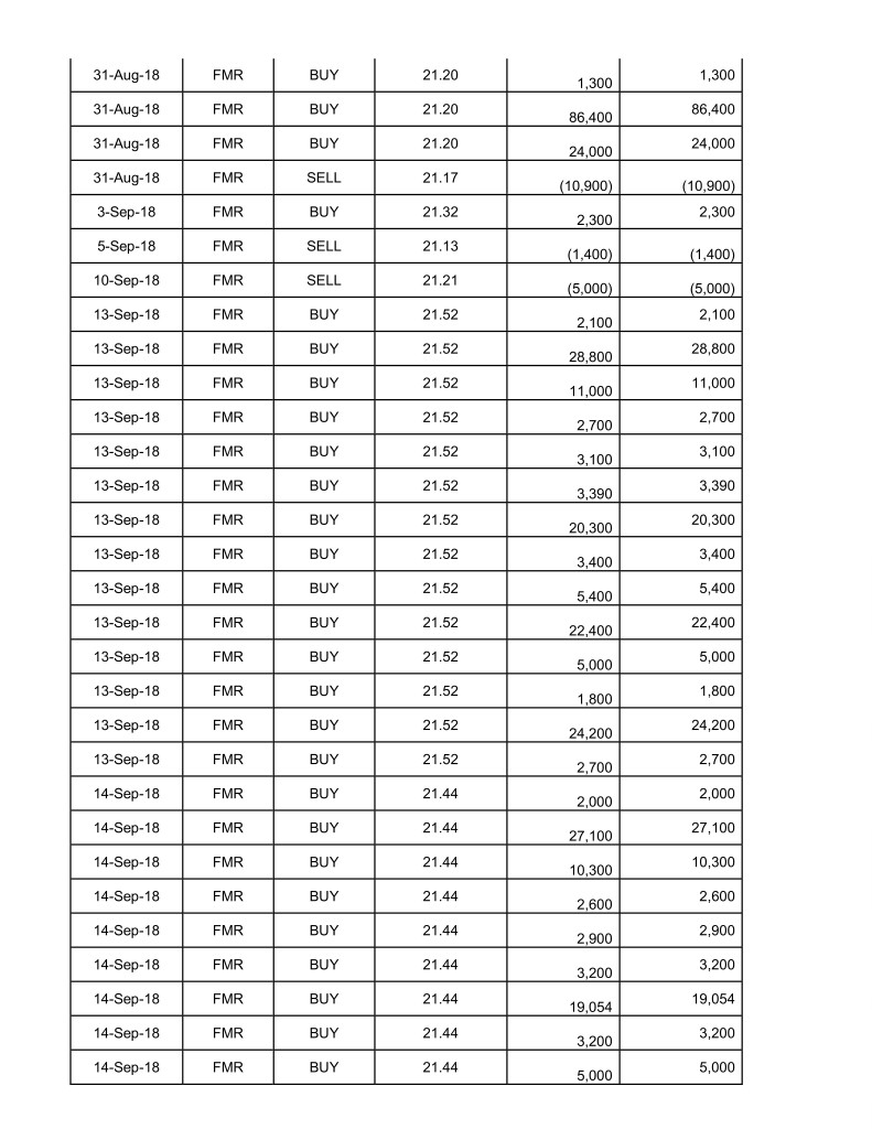 31-Aug-18 FMR BUY 21.20 600 600 31-Aug-18 FMR BUY 21.20 2,000 2,000 31-Aug-18 FMR BUY 21.20 27,700 27,700 31-Aug-18 FMR BUY 21.20 502,200 502,200 31-Aug-18 FMR BUY 21.20 1,300 1,300 31-Aug-18 FMR BUY 21.20 86,400 86,400 31-Aug-18 FMR BUY 21.20 24,000 24,000 31-Aug-18 FMR SELL 21.17 (10,900) (10,900) 3-Sep-18 FMR BUY 21.32 2,300 2,300 5-Sep-18 FMR SELL 21.13 (1,400) (1,400) 10-Sep-18 FMR SELL 21.21 (5,000) (5,000) 13-Sep-18 FMR BUY 21.52 2,100 2,100 13-Sep-18 FMR BUY 21.52 28,800 28,800 13-Sep-18 FMR BUY 21.52 11,000 11,000 13-Sep-18 FMR BUY 21.52 2,700 2,700 13-Sep-18 FMR BUY 21.52 3,100 3,100 13-Sep-18 FMR BUY 21.52 3,390 3,390 13-Sep-18 FMR BUY 21.52 20,300 20,300 13-Sep-18 FMR BUY 21.52 3,400 3,400 13-Sep-18 FMR BUY 21.52 5,400 5,400 13-Sep-18 FMR BUY 21.52 22,400 22,400 13-Sep-18 FMR BUY 21.52 5,000 5,000 13-Sep-18 FMR BUY 21.52 1,800 1,800 13-Sep-18 FMR BUY 21.52 24,200 24,200 13-Sep-18 FMR BUY 21.52 2,700 2,700 14-Sep-18 FMR BUY 21.44 2,000 2,000 14-Sep-18 FMR BUY 21.44 27,100 27,100 14-Sep-18 FMR BUY 21.44 10,300 10,300 14-Sep-18 FMR BUY 21.44 2,600 2,600 14-Sep-18 FMR BUY 21.44 2,900 2,900