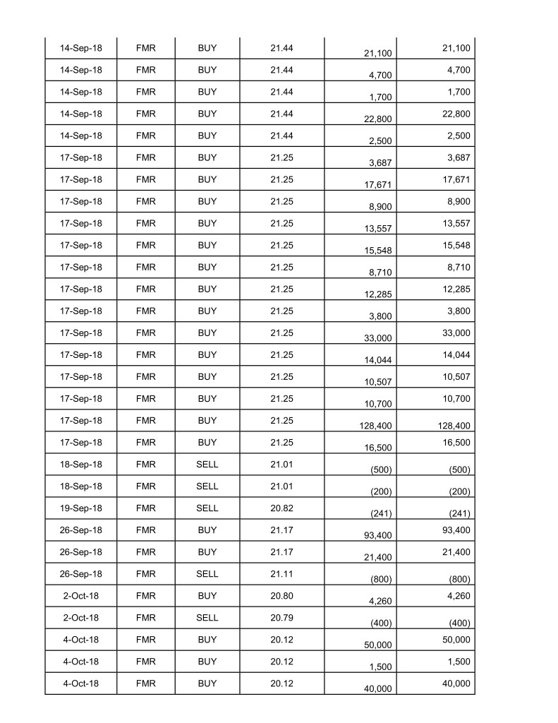 14-Sep-18 FMR BUY 21.44 21,100 21,100 14-Sep-18 FMR BUY 21.44 4,700 4,700 14-Sep-18 FMR BUY 21.44 1,700 1,700 14-Sep-18 FMR BUY 21.44 22,800 22,800 14-Sep-18 FMR BUY 21.44 2,500 2,500 17-Sep-18 FMR BUY 21.25 3,687 3,687 17-Sep-18 FMR BUY 21.25 17,671 17,671 17-Sep-18 FMR BUY 21.25 8,900 8,900 17-Sep-18 FMR BUY 21.25 13,557 13,557 17-Sep-18 FMR BUY 21.25 15,548 15,548 17-Sep-18 FMR BUY 21.25 8,710 8,710 17-Sep-18 FMR BUY 21.25 12,285 12,285 17-Sep-18 FMR BUY 21.25 3,800 3,800 17-Sep-18 FMR BUY 21.25 33,000 33,000 17-Sep-18 FMR BUY 21.25 14,044 14,044 17-Sep-18 FMR BUY 21.25 10,507 10,507 17-Sep-18 FMR BUY 21.25 10,700 10,700 17-Sep-18 FMR BUY 21.25 128,400 128,400 17-Sep-18 FMR BUY 21.25 16,500 16,500 18-Sep-18 FMR SELL 21.01 (500) (500) 18-Sep-18 FMR SELL 21.01 (200) (200) 19-Sep-18 FMR SELL 20.82 (241) (241) 26-Sep-18 FMR BUY 21.17 93,400 93,400 26-Sep-18 FMR BUY 21.17 21,400 21,400 26-Sep-18 FMR SELL 21.11 (800) (800) 2-Oct-18 FMR BUY 20.80 4,260 4,260 2-Oct-18 FMR SELL 20.79 (400) (400) 4-Oct-18 FMR BUY 20.12 50,000 50,000 4-Oct-18 FMR BUY 20.12 1,500 1,500 4-Oct-18 FMR BUY 20.12 40,000 40,000